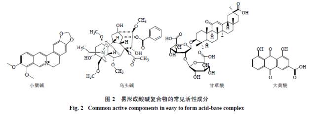 有机酸与生物碱的沉淀机制也是酸碱络合。某些酸性较强的氨基酸、酒石酸、绿原酸等遇到碱性较强的季铵碱时,易发生相互作用。复方三黄注射液中绿原酸与小檗碱[6]、复方泻心汤中大黄酸与小檗碱[13]均被证明存在相互作用产生沉淀。有文献报道[14],甘草酸在酸性环境下易析出形成沉淀,而调至碱性环境后则不出现沉淀,从侧面反映出酸碱络合理论的合理性。