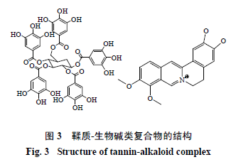某些鞣质具有明显的酸性,如没食子酸鞣质,遇到碱性物质时,易与其络合(图3)。研究发现,鞣质可作为解毒剂,治疗生物碱或重金属中毒[18]。孙启明等[6]在研究苦参注射液时发现大黄鞣质与苦参碱能络合,生成不溶性鞣酸苦参碱。所以,在含有鞣质与生物碱类成分的中药方剂中,应格外注意其中含有的鞣质与生物碱相互作用对药性、治疗效果的影响。