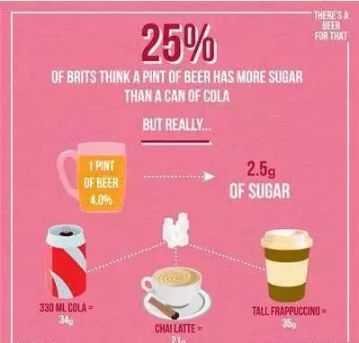 一品脱啤酒只有2.5克糖,远远低于,一罐可乐所含的34克糖,一杯茶拿铁所含的21克糖,一杯卡布奇诺所含的35克糖。至于现在超流行的各类奶茶,平均含糖量在每杯34克,相对于含脂量,啤酒可能是更健康的饮料。