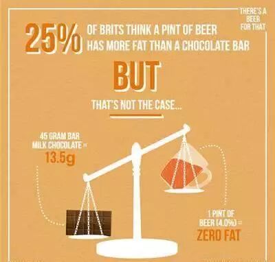 四分之一的英国人认为:一品脱啤酒所含脂肪比一块巧克力要高。但真相是:45克的牛奶巧克力有13.9克脂肪而一杯酒精含量为4%的啤酒是零脂肪的,啤酒含糖量比可乐、咖啡还要低。