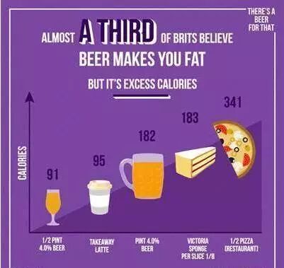 一块蛋糕、半个披萨的热量都要比一品脱啤酒高,一杯啤酒的脂肪含量比一块巧克力低。