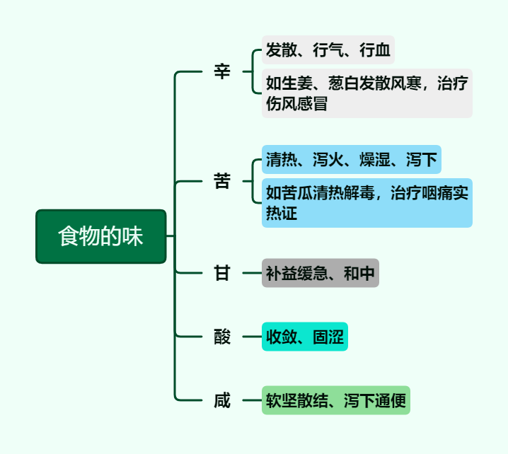 食物的味就是指食物具体的味道,主要有五种,即辛、苦、甘、酸、咸。它们分别有不同的作用,如图2所示。