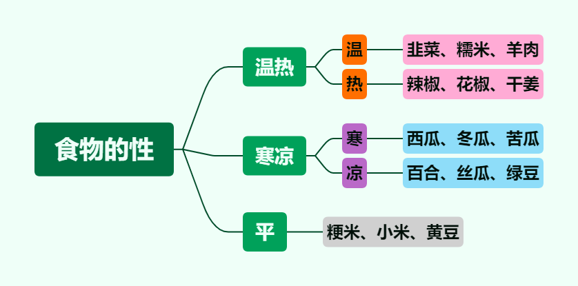 食物具有寒、凉、温、热四种性质,还有一类食物,寒热性质都不太明显,作用比较和缓,则归于平性。一般来说,寒凉性食物多有滋阴、清热、泻火、凉血、解毒等作用,温热性食物多有温经、散寒、补阳、活血、通络等作用,平性食物大多具有补益滋养的作用。下面图1,可帮助您理解和归类。