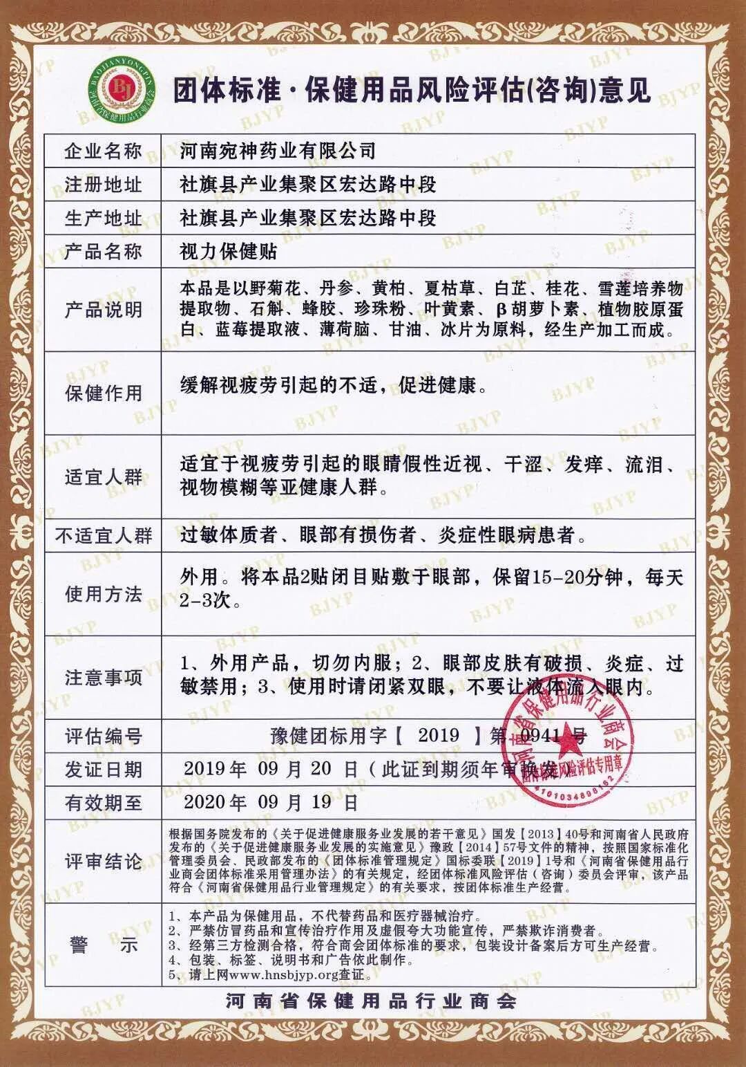 公司秉承了南阳宛神的传承,主要生产各类保健眼贴、眼宝、视力眼贴,并在工艺和配方上做了改进和提升。在产品分类上作出了细分:有针对学生的青少年保健眼贴、针对上班族、手机族缓解视力疲劳的视力眼贴、针对中老年眼部疾病的中老年眼贴。