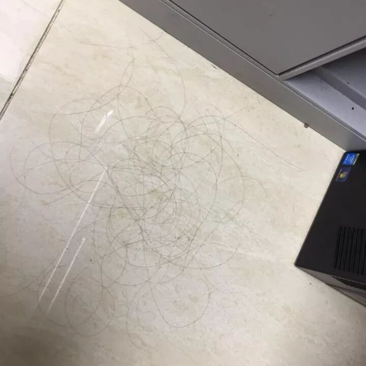 这一位是范儿姐办公室的同事,有一次路过她的工位,看到了一地头发,我骂她恶心!她非常气愤但又带着一丝隐忍地说:你以为我想吗,我不过就是趴着睡了一下,醒来刨了两哈头发就掉了一地。范儿姐赶紧掏出手机拍下了这惨烈的一幕 ↓↓↓