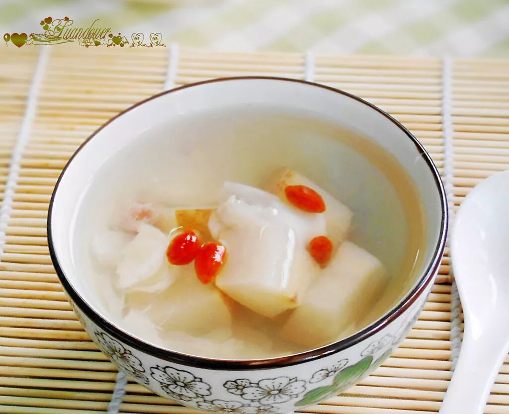 雪梨1个,鲜百合2朵,枸杞10粒,冰糖适量