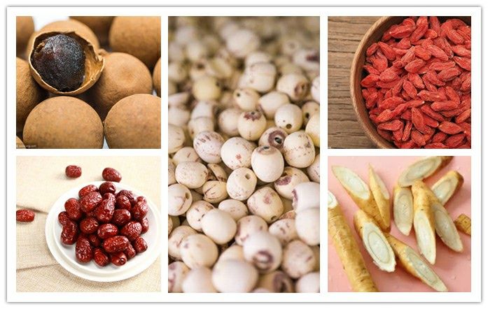 红枣10颗、莲子10颗、桂圆8颗、枸杞15粒、牛蒡50克