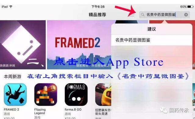 二、点击进入App Store ,在右上角搜索栏目中输入《名贵中药显微图鉴》