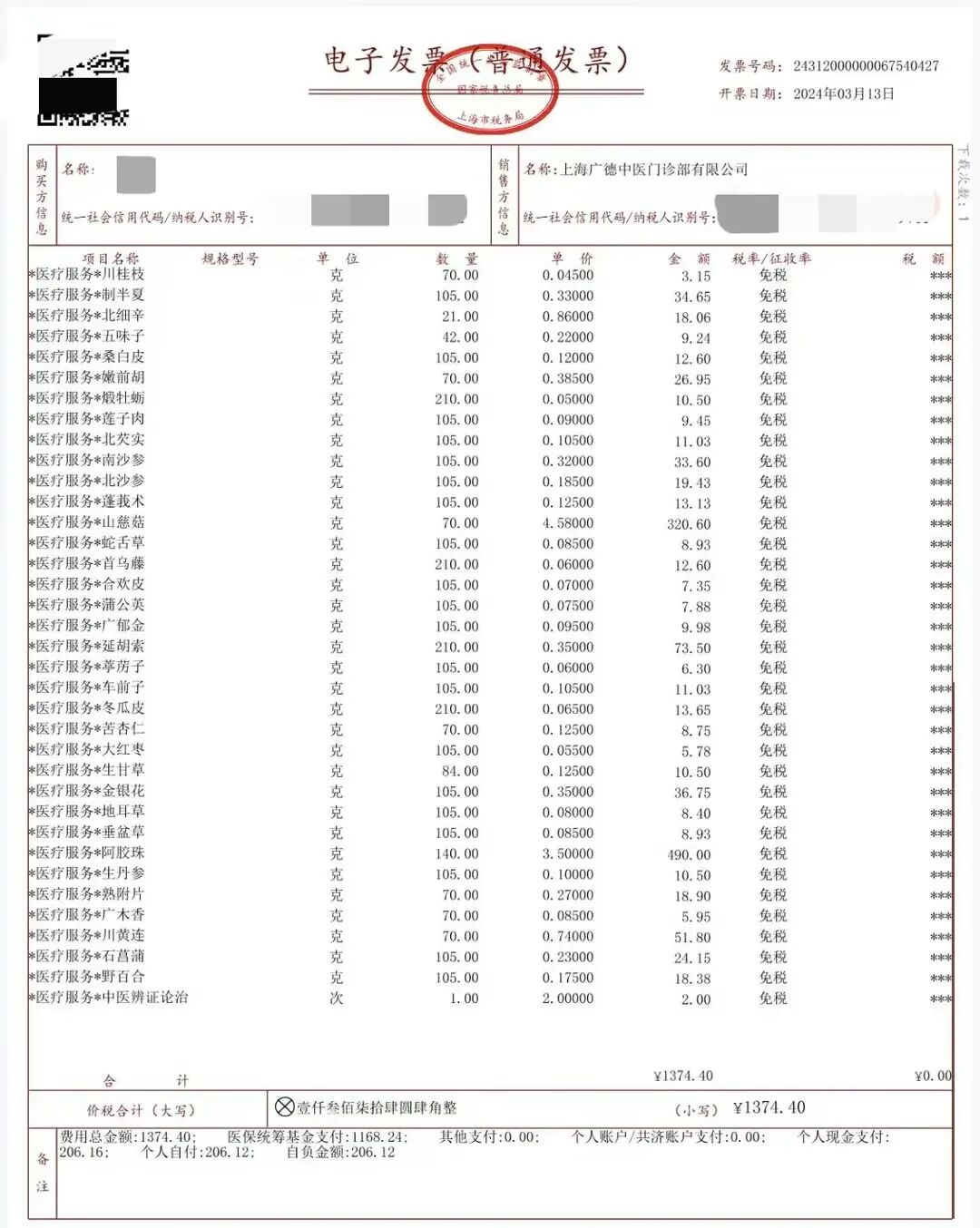 张先生说,这副中药方子里包含有30多种中草药,每剂中药分量为531克,总费用为1374.4元。