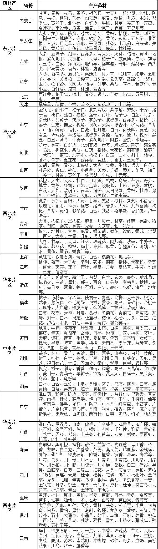 表2:当前国内中药材最新分区和品种分布