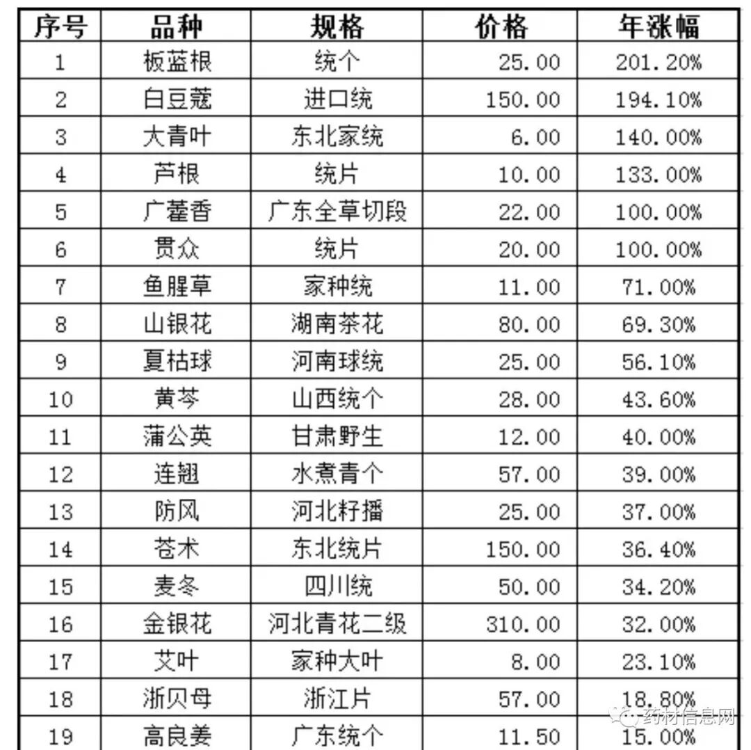 近年来,多种中药材价格,长期徘徊在成本线上。但中药材生产9年左右一个大周期——在物价上涨、疫情品种引领大势下,这些药材终将10年媳妇熬成婆,行情在2020年出现整体上行。因此,如果您的药材地块和基地已经苦苦支撑了多年,甚至连续亏损。那今年选择放弃,就应该慎重了——有可能一年的行情,就把3年的亏损给挣回来。2.2 药食两用品种生产,收益最为稳定