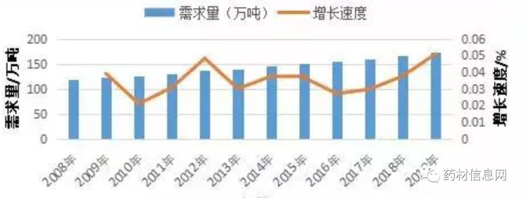 图3:2008—2019年国内药食两用品种需求增长图通过对综合200品种内药食两用品种需求量统计,近10年,109个药食两用品种(含最新纳入的9个试点品种,不含大枣和赤小豆),贡献了中药材80.06%的需求增长。2008—2019年,药食两用品种整体需求增长42.95%,年均增长率3.91%。2008—2019年,增长最快的10个品种分别是艾叶、三七、阿胶、决明子、桔梗、茯苓、火麻仁、广藿香、人参和枸杞子。增长的原因主要是民众日常保健需求意识增强,上述品种通过多种产品方式进入千家万户,消费量剧增。因此,近20年,生产适合普通民众使用的药食两用品种,收益最为稳定可靠,销路也容易得到保障。2.3 种植绿色兽用中药材,销路不用发愁