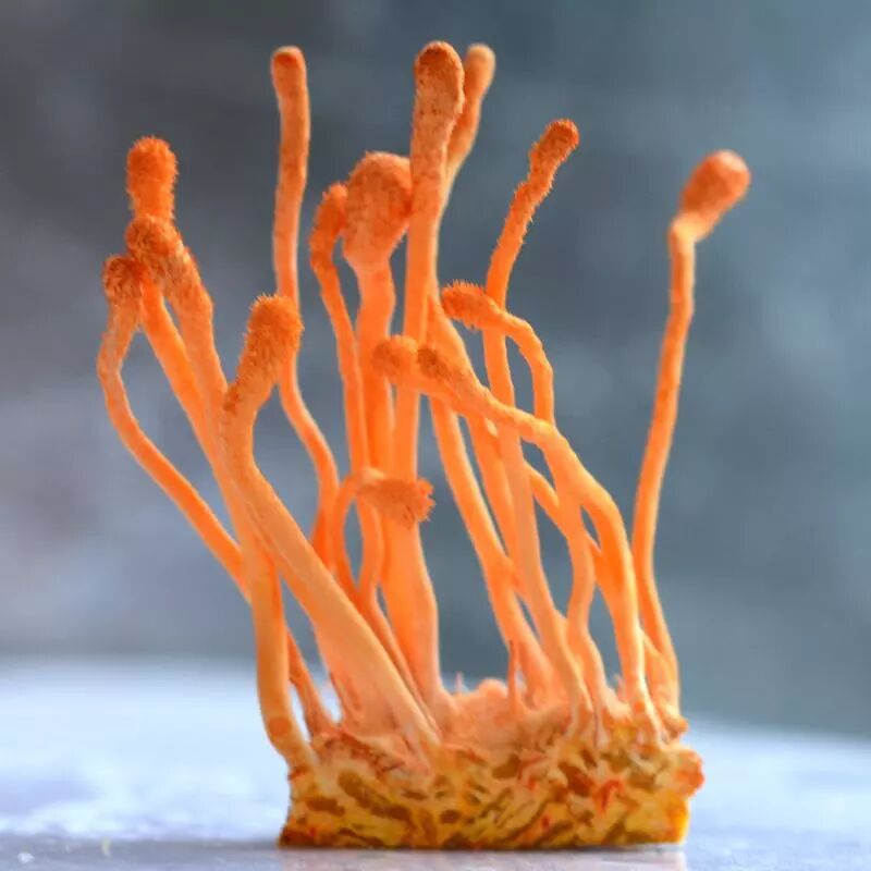 蛹虫草世界性分布,天然资源数量很少。1950年,德国科学家Cunningham观察到被蛹虫草寄生的昆虫组织不易腐烂,进而从中分离出一种抗菌性物质,3-脱氧腺苷,定名为虫草素。蛹虫草,多感染鳞翅目昆虫的蛹,由子座(即草部分,又称子实体)与菌核(即昆虫的尸体部分)两部分组成的复合体,简单来说,就是虫体与草的结合。