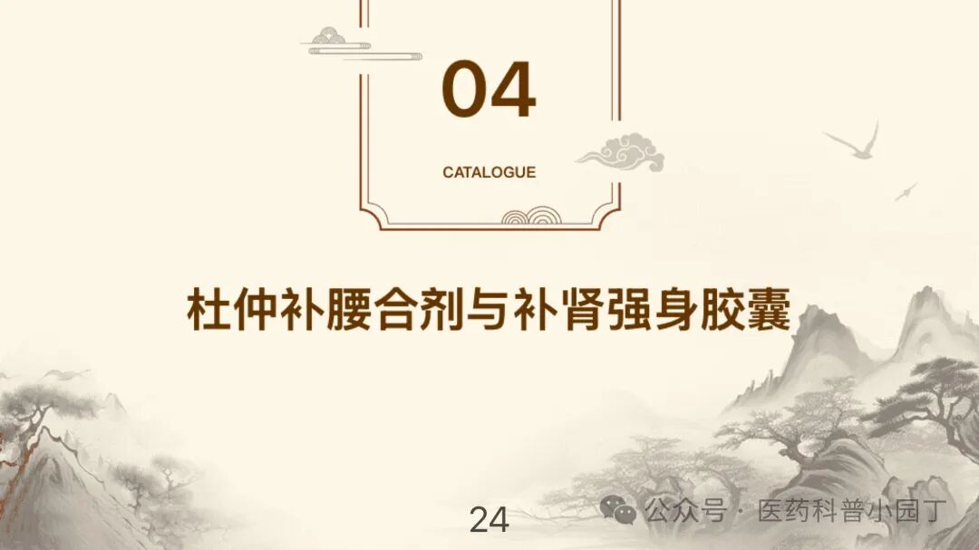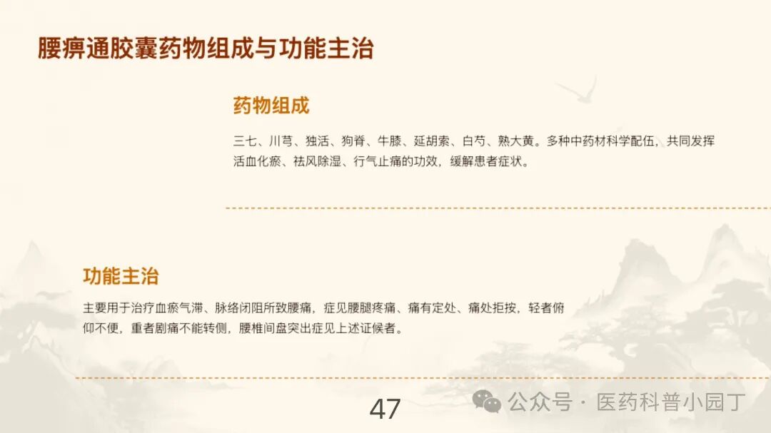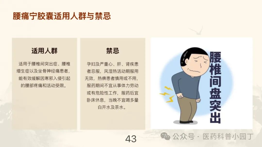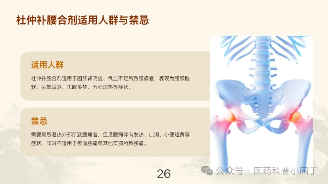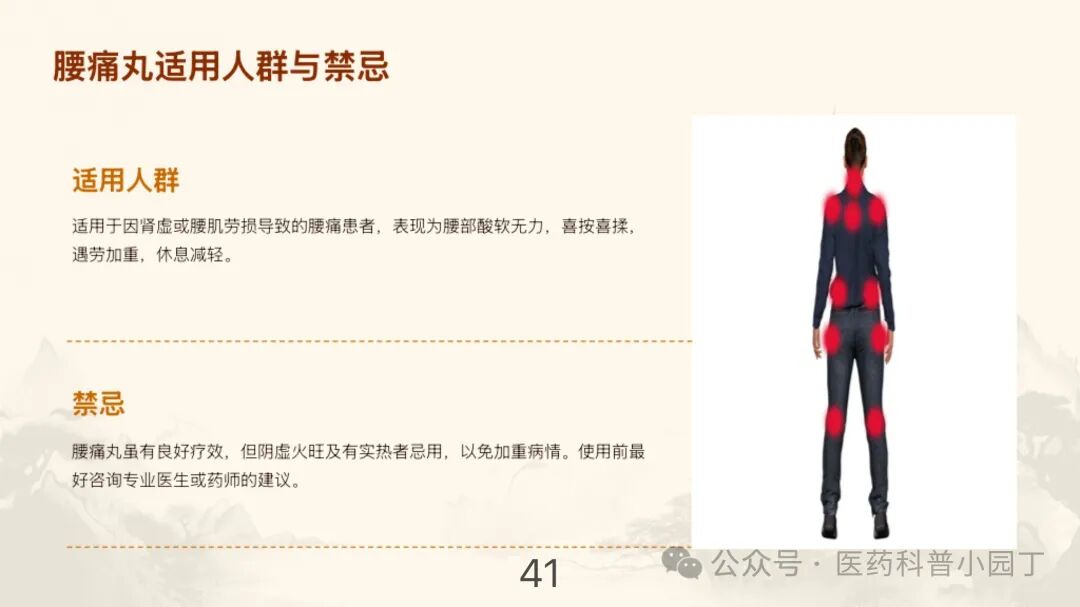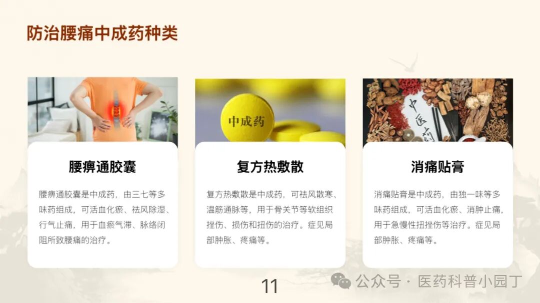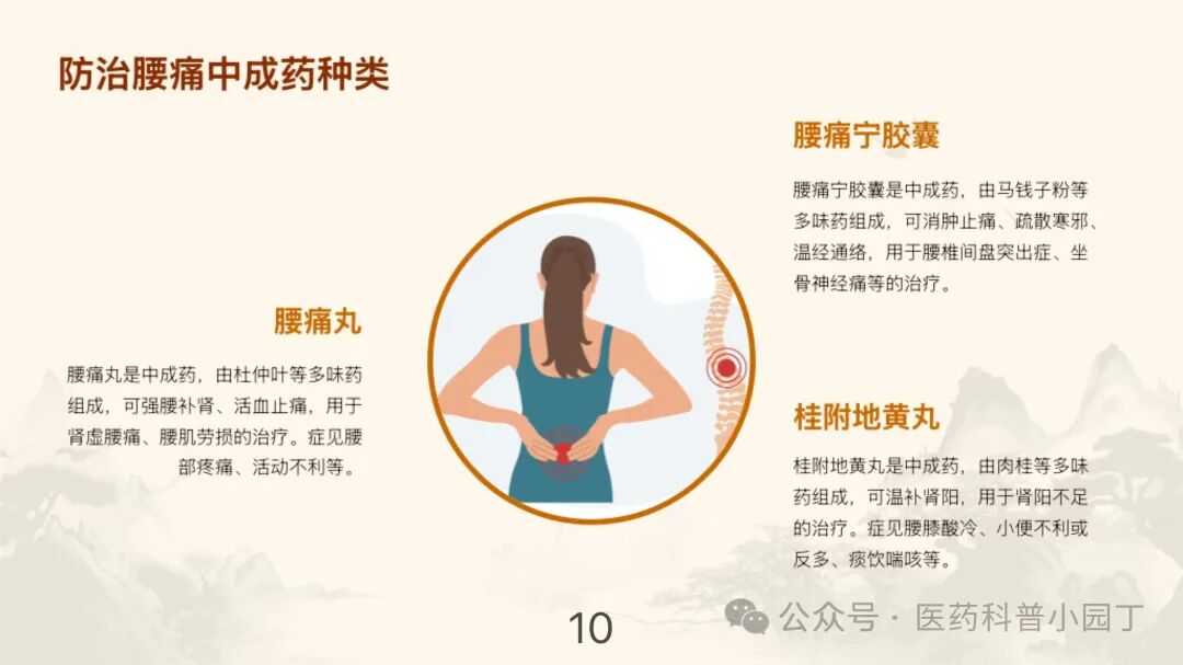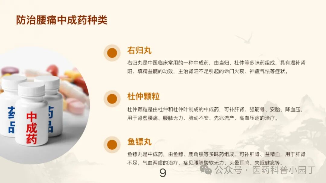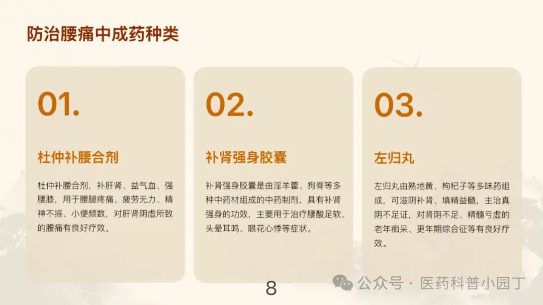 一、独活寄生合剂• 药物组成:独活、桑寄生、秦艽、防风、细辛、当归、白芍、川芎、熟地黄、杜仲(盐炙)、川牛膝、党参、茯苓、甘草、桂枝。• 功能主治:养血舒筋、祛风除湿、补益肝肾。用于风寒湿闭阻、肝肾两亏、气血不足所致的痹症,症见腰膝冷痛、屈伸不利。• 用法用量:口服,一次20ml,一日3次,用时摇匀。• 注意事项:孕妇禁用;儿童、老年人慎用。二、三金片• 药物组成:金樱根、菝葜、羊开口、金沙藤、积雪草。• 功能主治:清热解毒、利湿通淋、益肾。用于下焦湿热所致热淋、小便短赤、淋沥涩痛及湿热壅滞所致的腰痛。• 用法用量:口服,一次3片,一日3 - 4次。• 注意事项:对本品及所含成分过敏者禁用;孕妇禁用。三、跌打活血散• 药物组成:红花、当归、血竭、三七、骨碎补、续断、乳香(制)、没药(制)、儿茶、大黄、冰片、土鳖虫。• 功能主治:舒筋活血、散瘀止痛。主治跌打损伤、瘀血肿痛、闪腰岔气。• 用法用量:口服,一次3g,一日2次,用温黄酒或温开水送服;外用,以黄酒或醋调敷患处。• 注意事项:孕妇禁用。四、杜仲补腰合剂• 药物组成:杜仲、熟地黄、党参、当归、枸杞子、补骨脂、牛膝、菟丝子、猪腰子、香菇等。• 功能主治:补肝肾、益气血、强腰膝。用于腰腿疼痛、疲劳无力、精神不振、小便频数,对肝肾阴虚所致的腰痛有良好疗效。• 用法用量:口服,一次20ml,一日3次。• 注意事项:湿热外邪所致腰痛者忌用;瘀血腰痛或其他实邪所致腰痛者不宜使用。五、补肾强身胶囊• 药物组成:淫羊藿、狗脊(制)、女贞子(制)、菟丝子、金樱子等。• 功能主治:补肾强身。用于腰酸足软、头晕耳鸣、眼花心悸等症状。• 用法用量:口服,一次3粒,一日3次。• 注意事项:儿童、孕妇禁用。六、左归丸• 药物组成:熟地黄、山药、枸杞子、山茱萸、川牛膝、鹿角胶、龟甲胶、菟丝子等。• 功能主治:滋阴补肾、填精益髓。主治真阴不足证,症见头晕目眩、腰酸腿软、遗精滑泄、自汗盗汗、口燥舌干、舌红少苔、脉细等。• 用法用量:口服,一次9g,一日2次。• 注意事项:服药期间忌食生冷食物;孕妇、儿童慎用。七、右归丸• 药物组成:当归、杜仲、附子、枸杞子、鹿角胶、肉桂、山药、山茱萸、熟地黄、菟丝子等。• 功能主治:温补肾阳、填精益髓。主治肾阳不足引起的命门火衰、神疲气怯、畏寒肢冷、阳痿遗精、不能生育、腰膝酸软、小便自遗、肢节痹痛等症状。• 用法用量:口服,一次9g,一日3次。• 注意事项:肾虚有湿浊者不宜应用;服药期间忌食生冷食物;孕妇慎用。八、杜仲颗粒• 药物组成:杜仲与杜仲叶。• 功能主治:补肝肾、强筋骨、安胎、降血压。用于肾虚腰痛、腰膝无力、胎动不安、先兆流产、高血压症。• 用法用量:开水冲服,一次5g,一日2次。• 注意事项:外感或实热内盛者不宜服用;孕妇、高血压病、糖尿病患者应在医师指导下服用。九、鱼镖丸• 药物组成:鱼鳔、鹿角胶等多种中药材。• 功能主治:补肝肾、益精血。用于肝肾不足、气血两虚的治疗,症见腰膝酸软无力、头晕耳鸣、失眠健忘等。• 用法用量:口服,一次3g,一日2次。• 注意事项:孕妇禁用;阴虚阳亢、血分有热、胃火炽盛、肺有痰热、外感热病者慎服;宜饭前服用;年老体弱者和高血压患者慎用。十、腰痛丸• 药物组成:杜仲叶、补骨脂、狗脊、续断、当归、赤芍、白术、牛膝、泽泻、肉桂、乳香、土鳖虫。• 功能主治:强腰补肾、活血止痛。用于肾虚腰痛、腰肌劳损,症见腰部疼痛、活动不利等。• 用法用量:口服,一次4 - 6粒,一日3次。• 注意事项:阴虚火旺及有实热者忌用。十一、腰痛宁胶囊• 药物组成:马钱子粉、土鳖虫、麻黄、乳香、没药、川牛膝、全蝎、僵蚕、苍术、甘草。• 功能主治:消肿止痛、疏散寒邪、温经通络。用于腰椎间盘突出症、坐骨神经痛等的治疗。• 用法用量:黄酒兑少量温开水送服,一次4 - 6粒,一日1次,睡前半小时服或遵医嘱。• 注意事项:孕妇及严重心、肝、肾疾患者忌服;风湿热活动期服用无效;热痹患者慎用或不用;服药期间不宜从事体力劳动或有危险性工作;服药后宜卧床休息;当晚不宜喝多量白开水及茶水。十二、桂附地黄丸• 药物组成:肉桂、附子、熟地黄、山茱萸、牡丹皮、山药、茯苓、泽泻。• 功能主治:温补肾阳。用于肾阳不足,症见腰膝酸冷、小便不利或反多、痰饮喘咳等。• 用法用量:口服,水蜜丸一次6g,小蜜丸一次9g,大蜜丸一次1丸,一日2次。• 注意事项:忌不易消化食物;治疗期间宜节制房事;感冒发热患者不宜服用;阴虚内热者不适用;有高血压等慢性病且严重者应在医师指导下服用;孕妇慎用。十三、腰痹通胶囊• 药物组成:三七、川芎、独活、狗脊、牛膝、延胡索、白芍、熟大黄。• 功能主治:活血化瘀、祛风除湿、行气止痛。用于血瘀气滞、脉络闭阻所致腰痛,症见腰腿疼痛、痛有定处、痛处拒按,轻者俯仰不便,重者剧痛不能转侧,腰椎间盘突出症见上述证候者。• 用法用量:口服,一次3粒,一日3次,宜饭后服用。• 注意事项:孕妇忌服;消化性溃疡患者慎服或遵医嘱。十四、复方热敷散• 药物组成:川芎、侧柏叶、独活等。• 功能主治:祛风散寒、温筋通脉、活血化瘀、活络消肿、消炎止痛。用于骨关节等软组织挫伤、损伤和扭伤,症见局部肿胀、疼痛等,也适用于