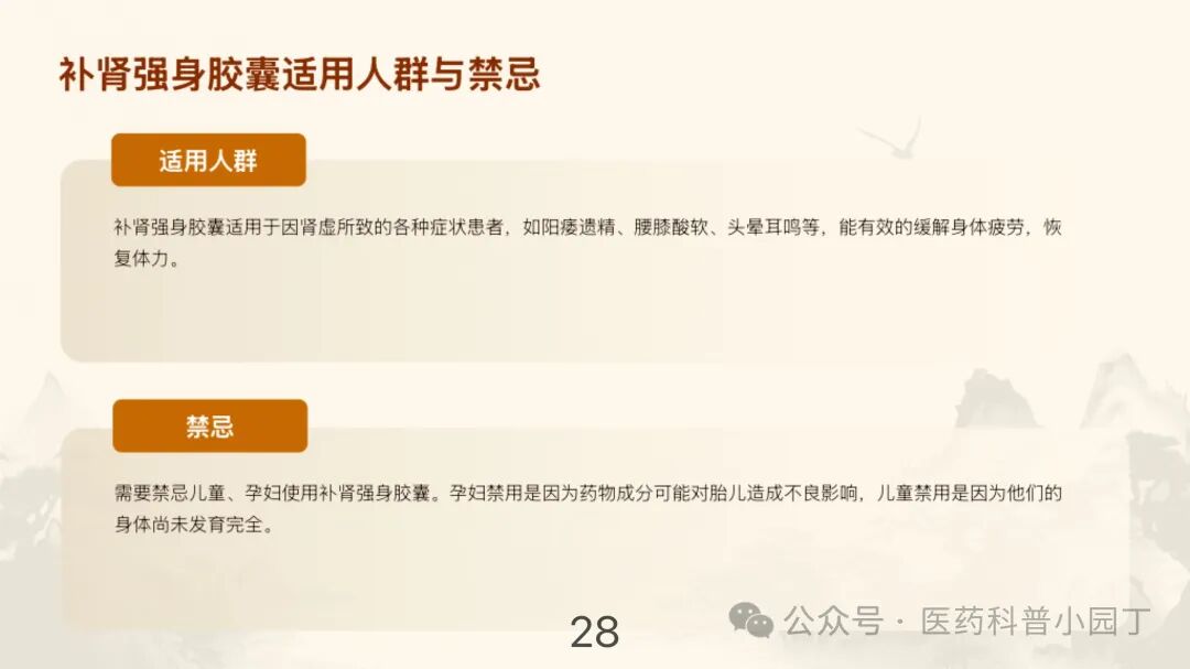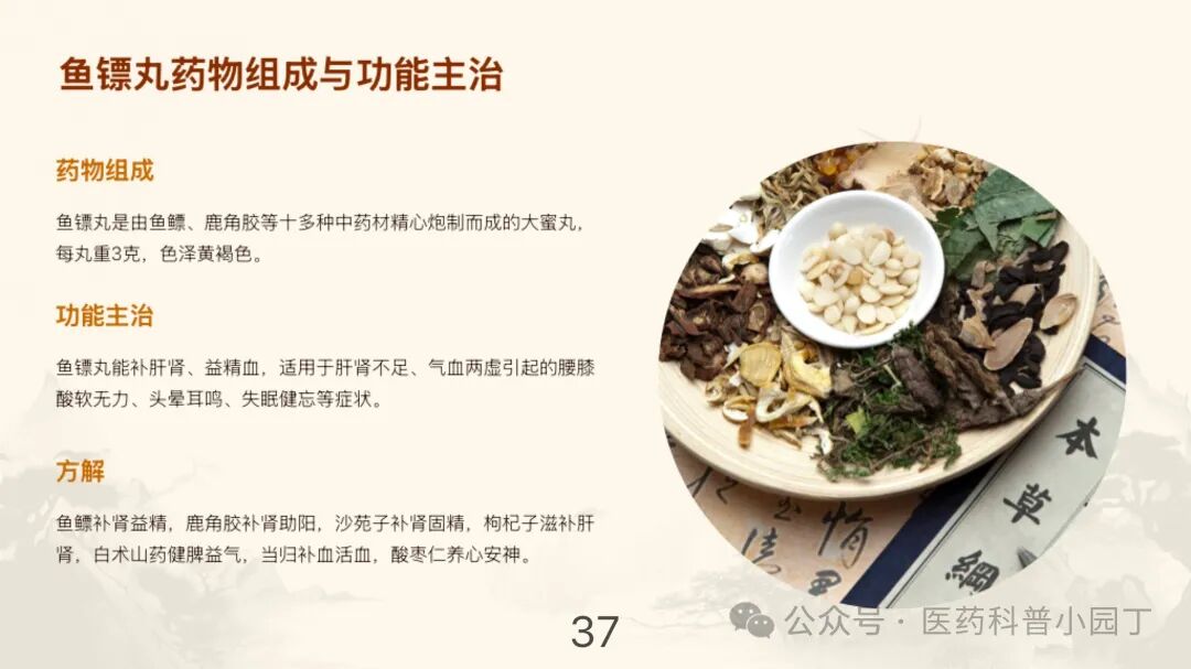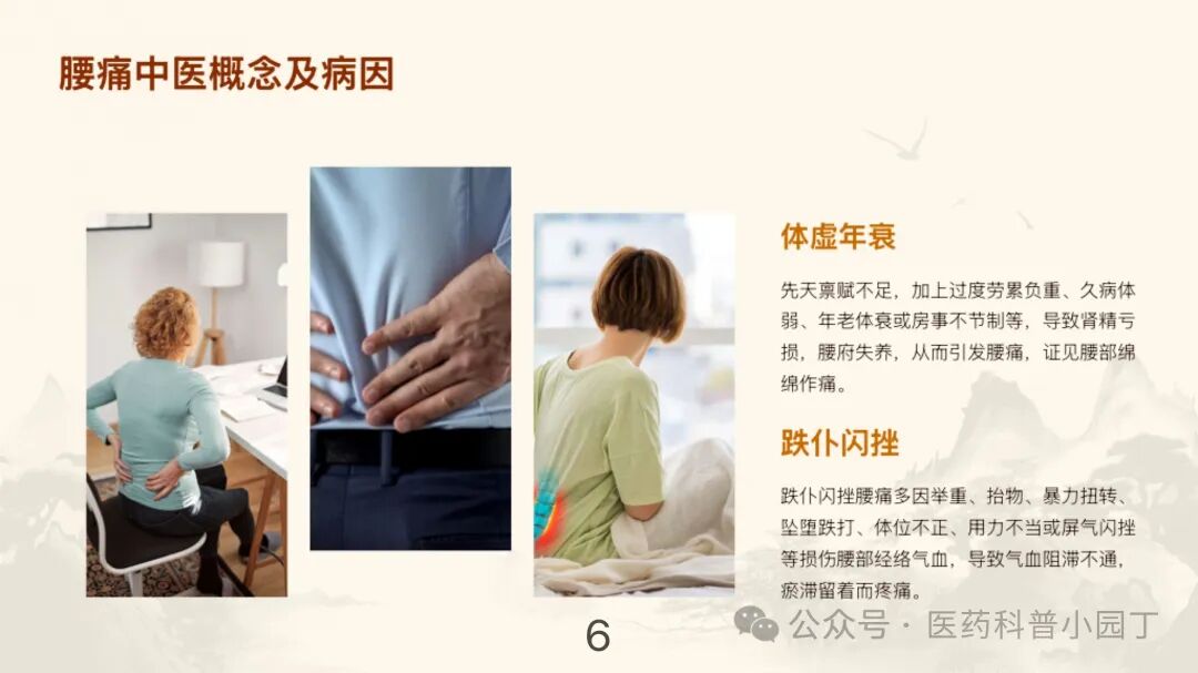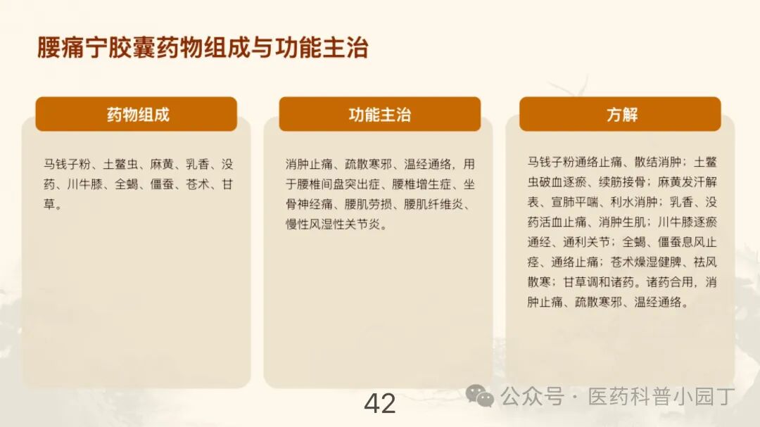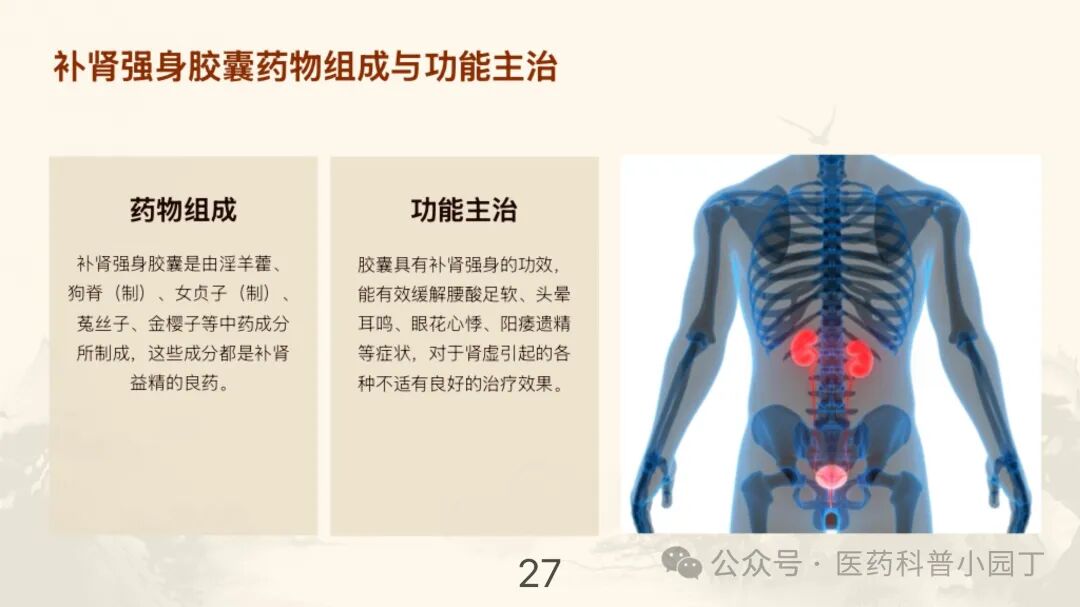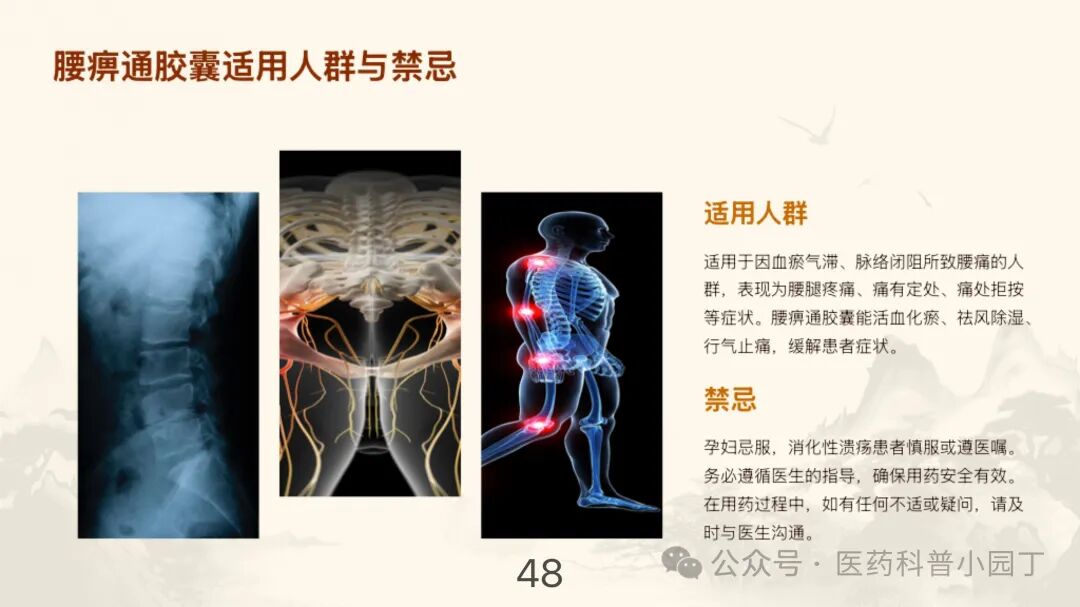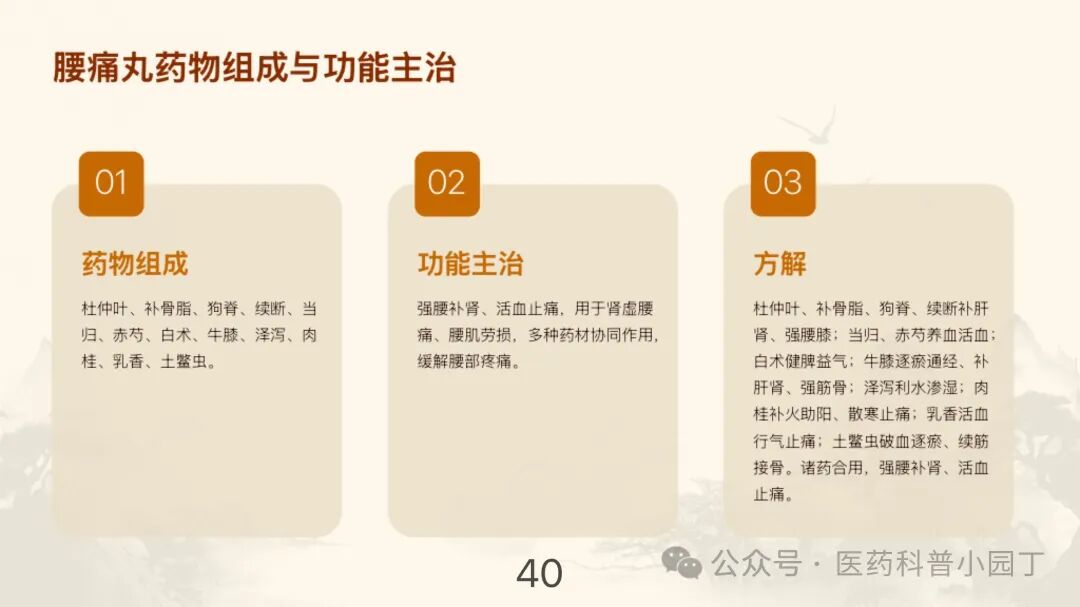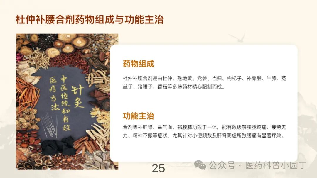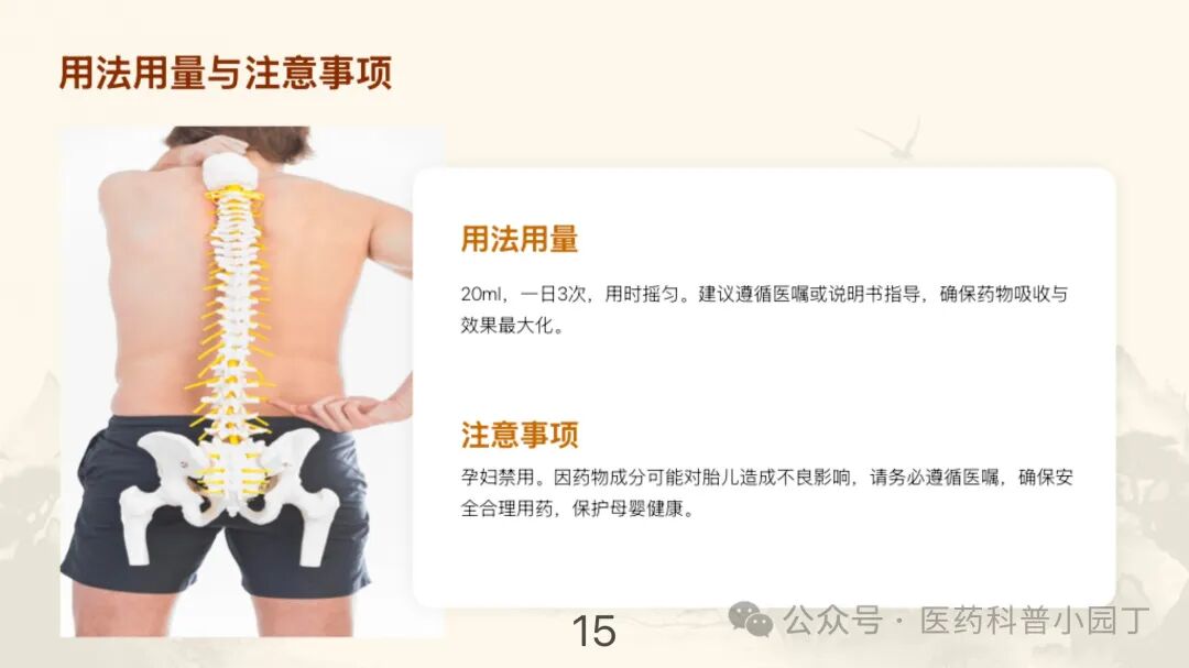 一、独活寄生合剂• 药物组成:独活、桑寄生、秦艽、防风、细辛、当归、白芍、川芎、熟地黄、杜仲(盐炙)、川牛膝、党参、茯苓、甘草、桂枝。• 功能主治:养血舒筋、祛风除湿、补益肝肾。用于风寒湿闭阻、肝肾两亏、气血不足所致的痹症,症见腰膝冷痛、屈伸不利。• 用法用量:口服,一次20ml,一日3次,用时摇匀。• 注意事项:孕妇禁用;儿童、老年人慎用。二、三金片• 药物组成:金樱根、菝葜、羊开口、金沙藤、积雪草。• 功能主治:清热解毒、利湿通淋、益肾。用于下焦湿热所致热淋、小便短赤、淋沥涩痛及湿热壅滞所致的腰痛。• 用法用量:口服,一次3片,一日3 - 4次。• 注意事项:对本品及所含成分过敏者禁用;孕妇禁用。三、跌打活血散• 药物组成:红花、当归、血竭、三七、骨碎补、续断、乳香(制)、没药(制)、儿茶、大黄、冰片、土鳖虫。• 功能主治:舒筋活血、散瘀止痛。主治跌打损伤、瘀血肿痛、闪腰岔气。• 用法用量:口服,一次3g,一日2次,用温黄酒或温开水送服;外用,以黄酒或醋调敷患处。• 注意事项:孕妇禁用。四、杜仲补腰合剂• 药物组成:杜仲、熟地黄、党参、当归、枸杞子、补骨脂、牛膝、菟丝子、猪腰子、香菇等。• 功能主治:补肝肾、益气血、强腰膝。用于腰腿疼痛、疲劳无力、精神不振、小便频数,对肝肾阴虚所致的腰痛有良好疗效。• 用法用量:口服,一次20ml,一日3次。• 注意事项:湿热外邪所致腰痛者忌用;瘀血腰痛或其他实邪所致腰痛者不宜使用。五、补肾强身胶囊• 药物组成:淫羊藿、狗脊(制)、女贞子(制)、菟丝子、金樱子等。• 功能主治:补肾强身。用于腰酸足软、头晕耳鸣、眼花心悸等症状。• 用法用量:口服,一次3粒,一日3次。• 注意事项:儿童、孕妇禁用。六、左归丸• 药物组成:熟地黄、山药、枸杞子、山茱萸、川牛膝、鹿角胶、龟甲胶、菟丝子等。• 功能主治:滋阴补肾、填精益髓。主治真阴不足证,症见头晕目眩、腰酸腿软、遗精滑泄、自汗盗汗、口燥舌干、舌红少苔、脉细等。• 用法用量:口服,一次9g,一日2次。• 注意事项:服药期间忌食生冷食物;孕妇、儿童慎用。七、右归丸• 药物组成:当归、杜仲、附子、枸杞子、鹿角胶、肉桂、山药、山茱萸、熟地黄、菟丝子等。• 功能主治:温补肾阳、填精益髓。主治肾阳不足引起的命门火衰、神疲气怯、畏寒肢冷、阳痿遗精、不能生育、腰膝酸软、小便自遗、肢节痹痛等症状。• 用法用量:口服,一次9g,一日3次。• 注意事项:肾虚有湿浊者不宜应用;服药期间忌食生冷食物;孕妇慎用。八、杜仲颗粒• 药物组成:杜仲与杜仲叶。• 功能主治:补肝肾、强筋骨、安胎、降血压。用于肾虚腰痛、腰膝无力、胎动不安、先兆流产、高血压症。• 用法用量:开水冲服,一次5g,一日2次。• 注意事项:外感或实热内盛者不宜服用;孕妇、高血压病、糖尿病患者应在医师指导下服用。九、鱼镖丸• 药物组成:鱼鳔、鹿角胶等多种中药材。• 功能主治:补肝肾、益精血。用于肝肾不足、气血两虚的治疗,症见腰膝酸软无力、头晕耳鸣、失眠健忘等。• 用法用量:口服,一次3g,一日2次。• 注意事项:孕妇禁用;阴虚阳亢、血分有热、胃火炽盛、肺有痰热、外感热病者慎服;宜饭前服用;年老体弱者和高血压患者慎用。十、腰痛丸• 药物组成:杜仲叶、补骨脂、狗脊、续断、当归、赤芍、白术、牛膝、泽泻、肉桂、乳香、土鳖虫。• 功能主治:强腰补肾、活血止痛。用于肾虚腰痛、腰肌劳损,症见腰部疼痛、活动不利等。• 用法用量:口服,一次4 - 6粒,一日3次。• 注意事项:阴虚火旺及有实热者忌用。十一、腰痛宁胶囊• 药物组成:马钱子粉、土鳖虫、麻黄、乳香、没药、川牛膝、全蝎、僵蚕、苍术、甘草。• 功能主治:消肿止痛、疏散寒邪、温经通络。用于腰椎间盘突出症、坐骨神经痛等的治疗。• 用法用量:黄酒兑少量温开水送服,一次4 - 6粒,一日1次,睡前半小时服或遵医嘱。• 注意事项:孕妇及严重心、肝、肾疾患者忌服;风湿热活动期服用无效;热痹患者慎用或不用;服药期间不宜从事体力劳动或有危险性工作;服药后宜卧床休息;当晚不宜喝多量白开水及茶水。十二、桂附地黄丸• 药物组成:肉桂、附子、熟地黄、山茱萸、牡丹皮、山药、茯苓、泽泻。• 功能主治:温补肾阳。用于肾阳不足,症见腰膝酸冷、小便不利或反多、痰饮喘咳等。• 用法用量:口服,水蜜丸一次6g,小蜜丸一次9g,大蜜丸一次1丸,一日2次。• 注意事项:忌不易消化食物;治疗期间宜节制房事;感冒发热患者不宜服用;阴虚内热者不适用;有高血压等慢性病且严重者应在医师指导下服用;孕妇慎用。十三、腰痹通胶囊• 药物组成:三七、川芎、独活、狗脊、牛膝、延胡索、白芍、熟大黄。• 功能主治:活血化瘀、祛风除湿、行气止痛。用于血瘀气滞、脉络闭阻所致腰痛,症见腰腿疼痛、痛有定处、痛处拒按,轻者俯仰不便,重者剧痛不能转侧,腰椎间盘突出症见上述证候者。• 用法用量:口服,一次3粒,一日3次,宜饭后服用。• 注意事项:孕妇忌服;消化性溃疡患者慎服或遵医嘱。十四、复方热敷散• 药物组成:川芎、侧柏叶、独活等。• 功能主治:祛风散寒、温筋通脉、活血化瘀、活络消肿、消炎止痛。用于骨关节等软组织挫伤、损伤和扭伤,症见局部肿胀、疼痛等,也适用于