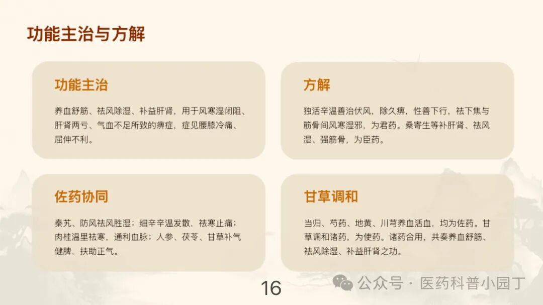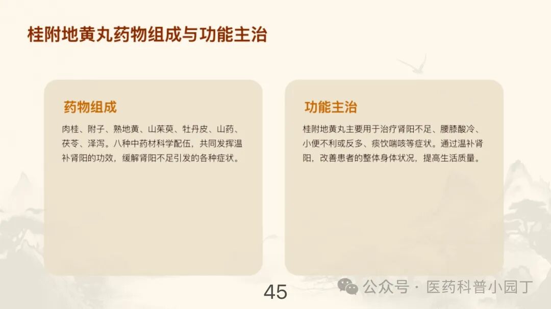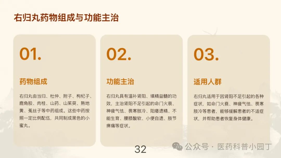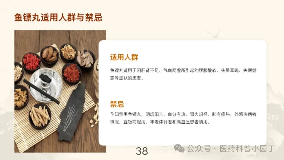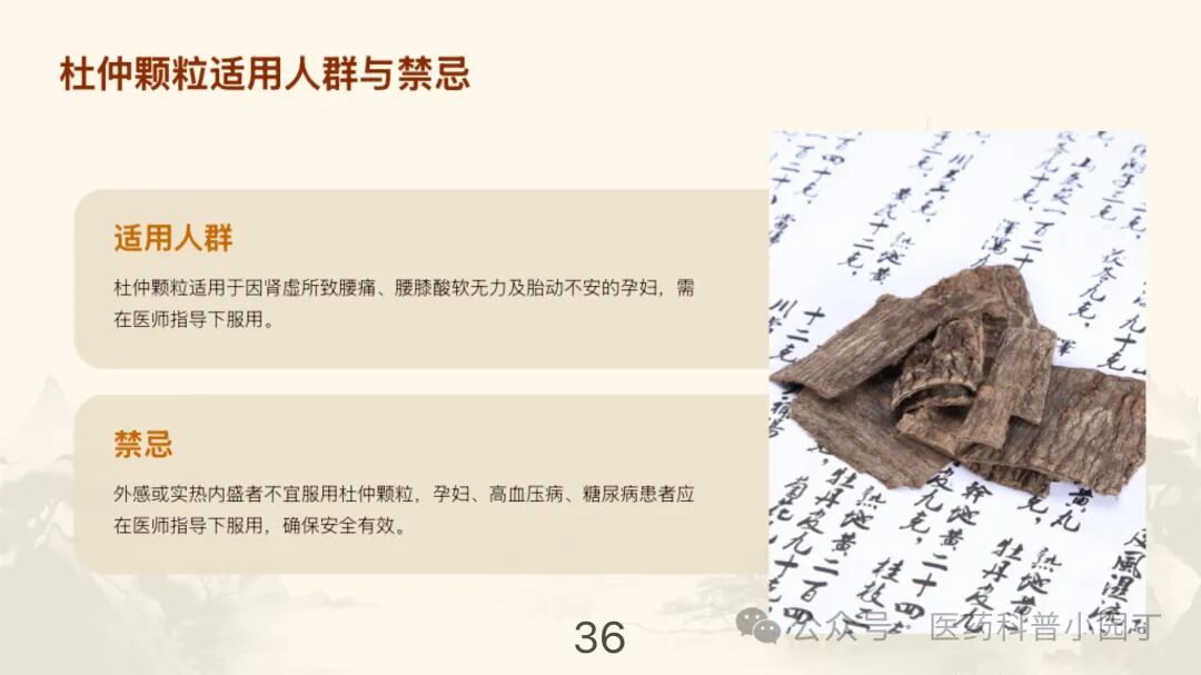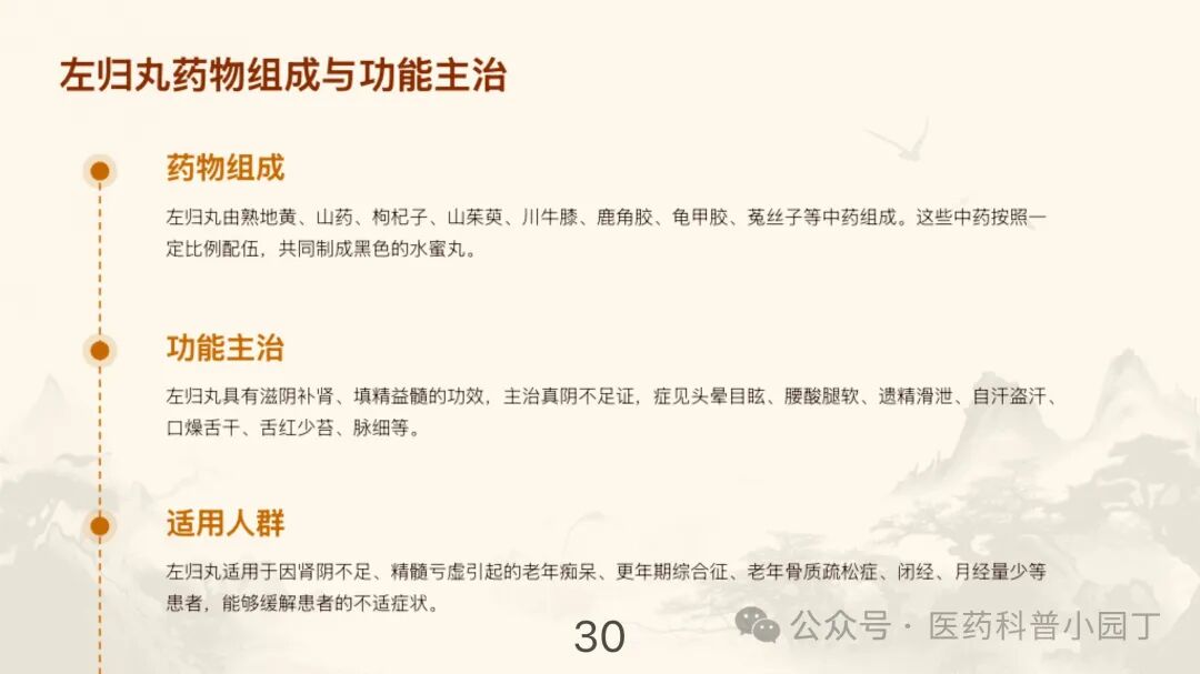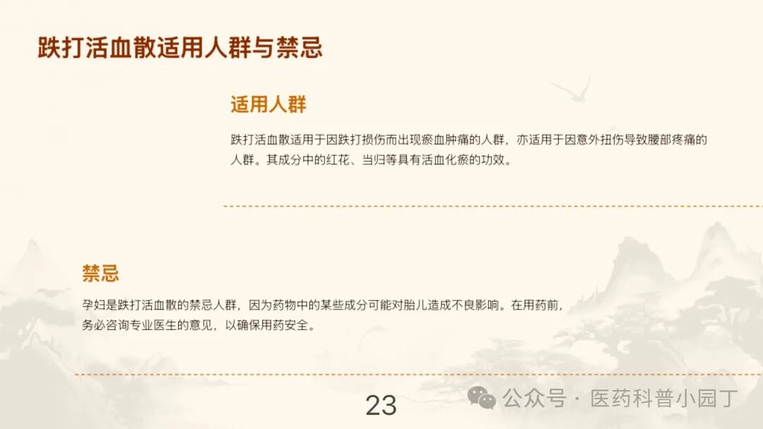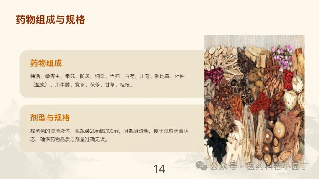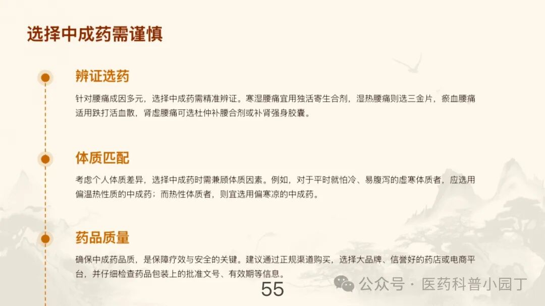 一、独活寄生合剂• 药物组成:独活、桑寄生、秦艽、防风、细辛、当归、白芍、川芎、熟地黄、杜仲(盐炙)、川牛膝、党参、茯苓、甘草、桂枝。• 功能主治:养血舒筋、祛风除湿、补益肝肾。用于风寒湿闭阻、肝肾两亏、气血不足所致的痹症,症见腰膝冷痛、屈伸不利。• 用法用量:口服,一次20ml,一日3次,用时摇匀。• 注意事项:孕妇禁用;儿童、老年人慎用。二、三金片• 药物组成:金樱根、菝葜、羊开口、金沙藤、积雪草。• 功能主治:清热解毒、利湿通淋、益肾。用于下焦湿热所致热淋、小便短赤、淋沥涩痛及湿热壅滞所致的腰痛。• 用法用量:口服,一次3片,一日3 - 4次。• 注意事项:对本品及所含成分过敏者禁用;孕妇禁用。三、跌打活血散• 药物组成:红花、当归、血竭、三七、骨碎补、续断、乳香(制)、没药(制)、儿茶、大黄、冰片、土鳖虫。• 功能主治:舒筋活血、散瘀止痛。主治跌打损伤、瘀血肿痛、闪腰岔气。• 用法用量:口服,一次3g,一日2次,用温黄酒或温开水送服;外用,以黄酒或醋调敷患处。• 注意事项:孕妇禁用。四、杜仲补腰合剂• 药物组成:杜仲、熟地黄、党参、当归、枸杞子、补骨脂、牛膝、菟丝子、猪腰子、香菇等。• 功能主治:补肝肾、益气血、强腰膝。用于腰腿疼痛、疲劳无力、精神不振、小便频数,对肝肾阴虚所致的腰痛有良好疗效。• 用法用量:口服,一次20ml,一日3次。• 注意事项:湿热外邪所致腰痛者忌用;瘀血腰痛或其他实邪所致腰痛者不宜使用。五、补肾强身胶囊• 药物组成:淫羊藿、狗脊(制)、女贞子(制)、菟丝子、金樱子等。• 功能主治:补肾强身。用于腰酸足软、头晕耳鸣、眼花心悸等症状。• 用法用量:口服,一次3粒,一日3次。• 注意事项:儿童、孕妇禁用。六、左归丸• 药物组成:熟地黄、山药、枸杞子、山茱萸、川牛膝、鹿角胶、龟甲胶、菟丝子等。• 功能主治:滋阴补肾、填精益髓。主治真阴不足证,症见头晕目眩、腰酸腿软、遗精滑泄、自汗盗汗、口燥舌干、舌红少苔、脉细等。• 用法用量:口服,一次9g,一日2次。• 注意事项:服药期间忌食生冷食物;孕妇、儿童慎用。七、右归丸• 药物组成:当归、杜仲、附子、枸杞子、鹿角胶、肉桂、山药、山茱萸、熟地黄、菟丝子等。• 功能主治:温补肾阳、填精益髓。主治肾阳不足引起的命门火衰、神疲气怯、畏寒肢冷、阳痿遗精、不能生育、腰膝酸软、小便自遗、肢节痹痛等症状。• 用法用量:口服,一次9g,一日3次。• 注意事项:肾虚有湿浊者不宜应用;服药期间忌食生冷食物;孕妇慎用。八、杜仲颗粒• 药物组成:杜仲与杜仲叶。• 功能主治:补肝肾、强筋骨、安胎、降血压。用于肾虚腰痛、腰膝无力、胎动不安、先兆流产、高血压症。• 用法用量:开水冲服,一次5g,一日2次。• 注意事项:外感或实热内盛者不宜服用;孕妇、高血压病、糖尿病患者应在医师指导下服用。九、鱼镖丸• 药物组成:鱼鳔、鹿角胶等多种中药材。• 功能主治:补肝肾、益精血。用于肝肾不足、气血两虚的治疗,症见腰膝酸软无力、头晕耳鸣、失眠健忘等。• 用法用量:口服,一次3g,一日2次。• 注意事项:孕妇禁用;阴虚阳亢、血分有热、胃火炽盛、肺有痰热、外感热病者慎服;宜饭前服用;年老体弱者和高血压患者慎用。十、腰痛丸• 药物组成:杜仲叶、补骨脂、狗脊、续断、当归、赤芍、白术、牛膝、泽泻、肉桂、乳香、土鳖虫。• 功能主治:强腰补肾、活血止痛。用于肾虚腰痛、腰肌劳损,症见腰部疼痛、活动不利等。• 用法用量:口服,一次4 - 6粒,一日3次。• 注意事项:阴虚火旺及有实热者忌用。十一、腰痛宁胶囊• 药物组成:马钱子粉、土鳖虫、麻黄、乳香、没药、川牛膝、全蝎、僵蚕、苍术、甘草。• 功能主治:消肿止痛、疏散寒邪、温经通络。用于腰椎间盘突出症、坐骨神经痛等的治疗。• 用法用量:黄酒兑少量温开水送服,一次4 - 6粒,一日1次,睡前半小时服或遵医嘱。• 注意事项:孕妇及严重心、肝、肾疾患者忌服;风湿热活动期服用无效;热痹患者慎用或不用;服药期间不宜从事体力劳动或有危险性工作;服药后宜卧床休息;当晚不宜喝多量白开水及茶水。十二、桂附地黄丸• 药物组成:肉桂、附子、熟地黄、山茱萸、牡丹皮、山药、茯苓、泽泻。• 功能主治:温补肾阳。用于肾阳不足,症见腰膝酸冷、小便不利或反多、痰饮喘咳等。• 用法用量:口服,水蜜丸一次6g,小蜜丸一次9g,大蜜丸一次1丸,一日2次。• 注意事项:忌不易消化食物;治疗期间宜节制房事;感冒发热患者不宜服用;阴虚内热者不适用;有高血压等慢性病且严重者应在医师指导下服用;孕妇慎用。十三、腰痹通胶囊• 药物组成:三七、川芎、独活、狗脊、牛膝、延胡索、白芍、熟大黄。• 功能主治:活血化瘀、祛风除湿、行气止痛。用于血瘀气滞、脉络闭阻所致腰痛,症见腰腿疼痛、痛有定处、痛处拒按,轻者俯仰不便,重者剧痛不能转侧,腰椎间盘突出症见上述证候者。• 用法用量:口服,一次3粒,一日3次,宜饭后服用。• 注意事项:孕妇忌服;消化性溃疡患者慎服或遵医嘱。十四、复方热敷散• 药物组成:川芎、侧柏叶、独活等。• 功能主治:祛风散寒、温筋通脉、活血化瘀、活络消肿、消炎止痛。用于骨关节等软组织挫伤、损伤和扭伤,症见局部肿胀、疼痛等,也适用于
