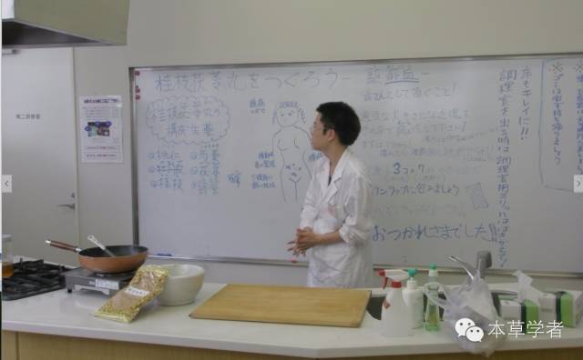 从植物到汤药的学习体验和考试告一段落,接下来由研究生登场,给大家讲解桂枝茯苓丸的制作过程,日本的小孩画漫的功底都不错,图文并茂的把桂枝茯苓丸的组方、功效、制作方法写在了黑板上,细心给大家讲解(上图)。