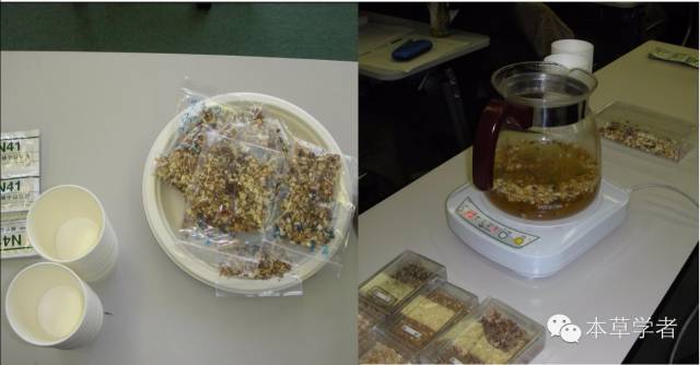品尝完药材的味道后,体验环节进一步延伸,将不同组方药材按量混合(上左图),然后开始煎药(上右图)。教授会借此讲解煎药文化和注意事项。待汤药煎好后,参与者开始用一次性纸杯品尝每种汤剂的味道,是苦味?还是甘味?参与者要深入思考是这些味道和刚才组方里的药材有何相关。