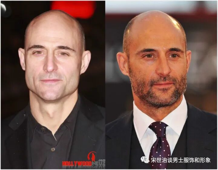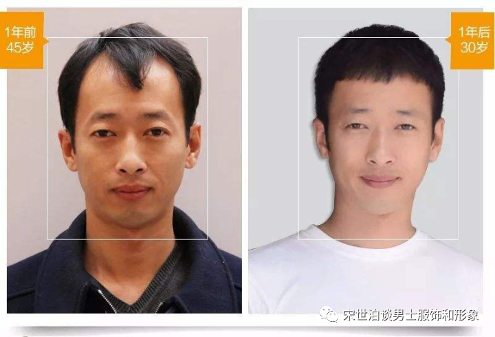 其实这是向前梳的发型带来的错觉。一旦留起背头甚至半背头,例如下图左的我是半背的分头,效果就显老、显突兀了。