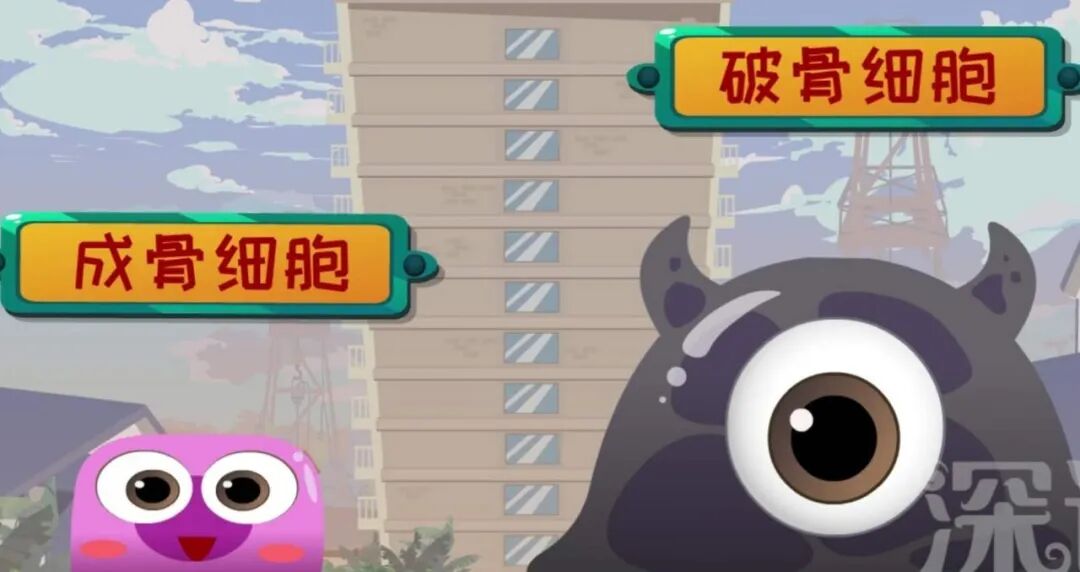 为什么破骨细胞也很重要呢?因为成骨细胞是盖房子的,但它有可能建错了,一旦建错了,骨头不就畸形了嘛,所以破骨细胞就好比监工。成骨细胞哪里建错了,它就直接贴在上面,吐出一种酸性物质,把建错的骨头溶解掉。