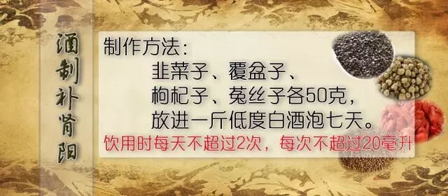 酒制补肾阳:韭菜子、菟丝子、枸杞子、覆盆子各50克,分别研磨碎后放入纱布包中包好,放进泡酒罐中,倒入一斤低度白酒或黄酒,密封浸泡7天后即可饮用。每天饮用量不超过2次,一次不超过20毫升。
