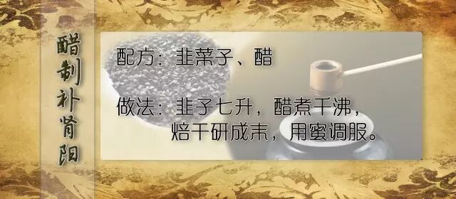 醋制补肾阳:不喝酒的人可以选用醋泡韭菜子的方法。韭菜子100克,放进醋里,中火煮开,放凉后反复煮,煮开多次后,将韭菜子捞出,烘焙干,碾碎成末后与蜂蜜混合成蜜丸食用即可。用醋泡过的韭菜子补肾作用更强,并且还有疏肝敛肝的功效。
