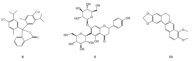 磷酸酶抑制剂通过调节关键信号分子的磷酸化状态进而调节肝糖异生过程,因此检测化合物或多肽对磷酸酶功能的活性是筛选药物的一个常用策略。近年来研究证实多种一线降糖药物如二甲双胍、噻唑烷二酮通过增强AMPK的磷酸化,增强CRTC2的磷酸化,抑制CRTC2入核,抑制CRTC2的转录共激活活性,从而在整体上改善高血糖症。研究者开发出一种偶联腺苷的富含精氨酸多肽,这种多肽能结合PKA催化亚基并抑制其活性,而抑制CREB磷酸化和CRTC2去磷酸化及它们的转录活性,具有抑制肝糖异生的潜在活性。研究表明小分子saponarin(9)与小檗碱berberine(10)能以AMPK为主要靶蛋白,增强CRTC2磷酸化,进而抑制CREB介导的糖异生过程。然而,在该机制被揭示以前,这些化合物已经被广泛地应用于包括免疫调节、肿瘤治疗以及代谢调控等多个方面。因此,充分了解一线降糖药物的药理作用机制,深入发掘传统药物的活性成分,不但有利于开发针对AMPK、PKA、PKC等关键信号分子的磷酸酶调节剂,而且能为设计新型糖异生抑制剂提供理论基础。