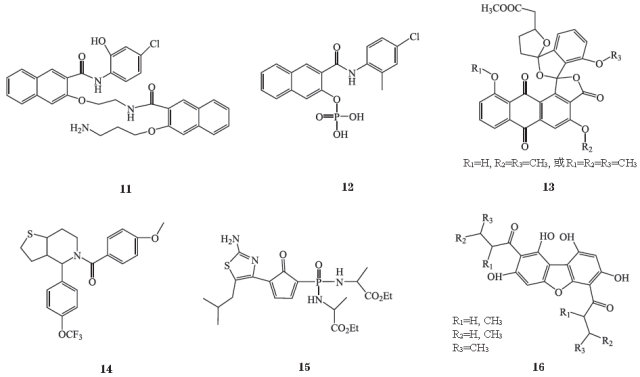 筛选和设计糖异生限速酶的抑制剂是研发新型降糖药物的另一个热点。G6Pase负责2条肝糖生成途径(糖原裂解和糖异生)的最后一步反应,是肝糖生成的最后一步关键酶。目前已发现天然产物蒽醌的类似物mumbaistatin(13)是G6Pase转位酶G6PT1的高效抑制剂,而氢吡啶噻吩化合物(14) 是G6Pase催化亚基的酶活抑制剂(IC50=350 nmol· L-1)。研究证明,MB06322(CS-917,15)通过靶向抑制果糖-1,6-二磷酸酶(fructose-1,6-bisphosphatase,FBP)的活性,降低自发性糖尿病大鼠(Goto Kakizakirat)的进食后高血糖。研究者通过比较FBP天然底物的结构,设计并合成了能够特异性结合FBP的小分子抑制剂(16),其IC50接近天然抑制剂腺苷酸(adenosine monophospate,AMP)。根据天然底物与PEPCK的构象,研究人员对PEPCK底物oxaloaetate(OAA)等进行改造,所得小分子能竞争性结合胞质型PEPCK,并抑制该酶催化形成磷酸烯醇式丙酮酸的酶活性,进而降低肝糖异生效能。