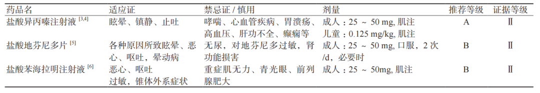 对于眩晕持续时间长、程度重,尤其是伴随恶心、呕吐、出汗等较为严重的自主神经反应者,可以短期使用前庭抑制剂(推荐强度B,证据等级Ⅱ)控制眩晕症状(原则上使用不超过72 h),必要时可以止吐治疗(推荐强度A,证据等级Ⅱ)。常用药物有盐酸异丙嗪、盐酸地芬尼多片、盐酸苯海拉明等(见表1)。