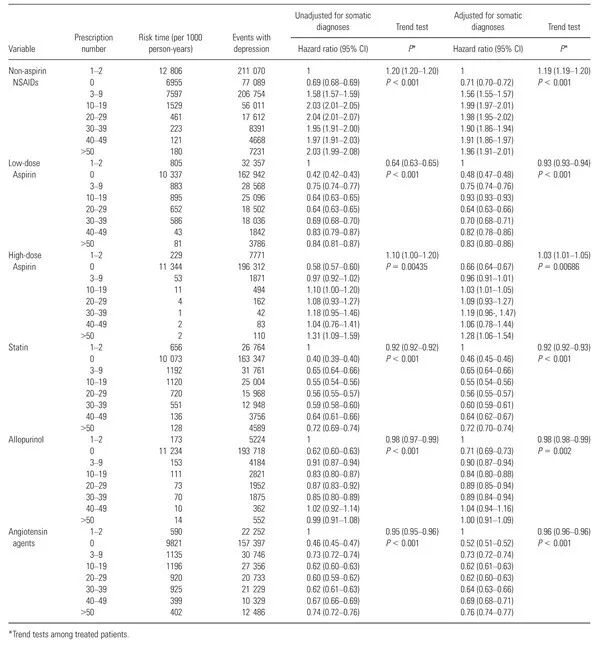 趋势检验显示,对于低剂量阿司匹林、他汀类药物、别嘌醇及血管紧张素能药物而言,持续用药者罹患抑郁的HR相比于未用药时呈下降趋势,即便在调整躯体疾病诊断后仍成立。