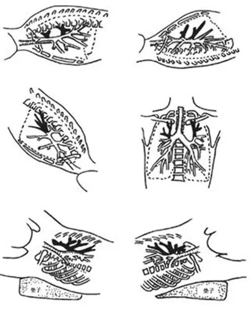 a.病灶在后方,应取俯卧姿势;b.病灶在前方,应取仰卧姿势;c.病灶在下方,应取斜向下俯卧姿势;d.病灶在上方,应取竖直姿势;e.病灶在左上方,应向右侧卧;f.病灶在右上方,应向左侧卧。
