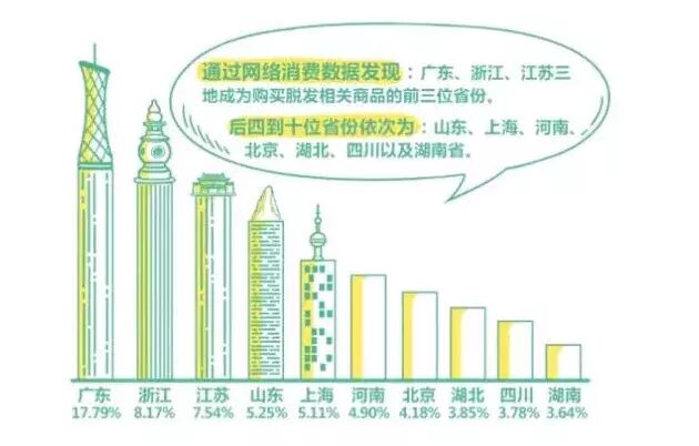为了拯救脱发,男性、女性会不约而同地选择购买植发、护发相关商品以及服务。根据《拯救脱发趣味白皮书》,湖北是植发、护发相关商品需求量省份排行榜第八位。前十位省份(直辖市)依次为:广东、浙江、江苏、山东、上海、河南、北京、湖北、四川以及湖南。