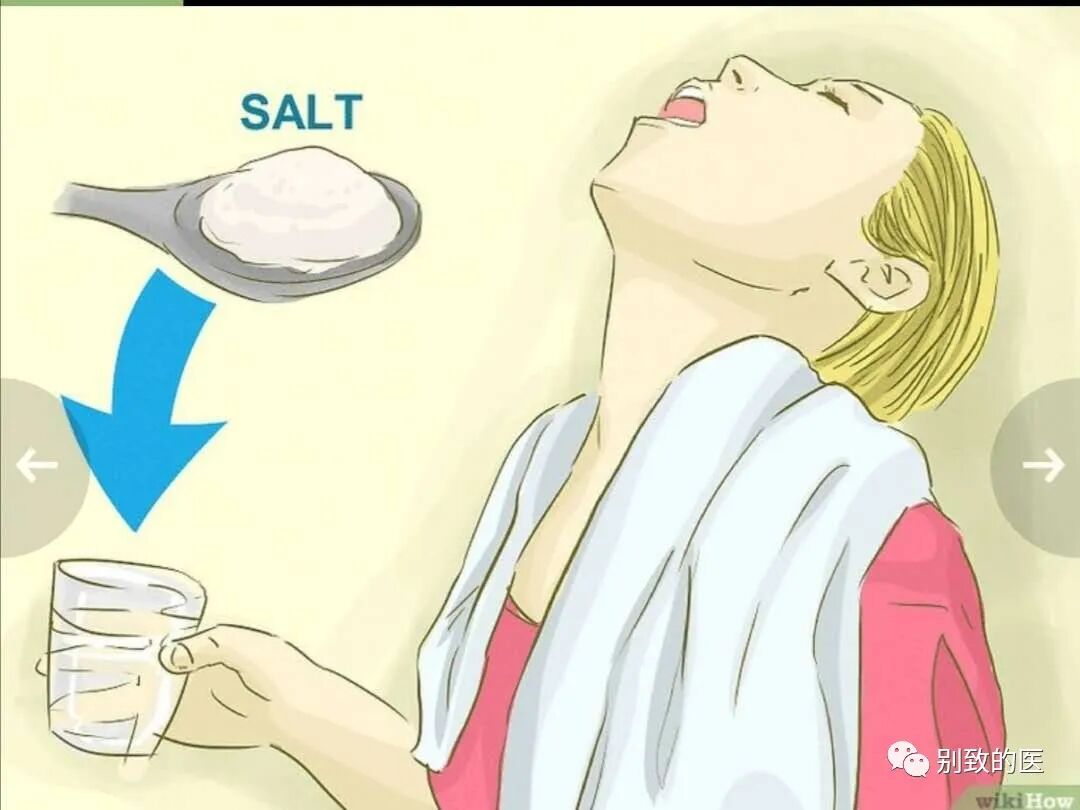 用盐水漱口,将半汤匙的盐溶入一杯温水中,然后头部后仰,用温水漱口。