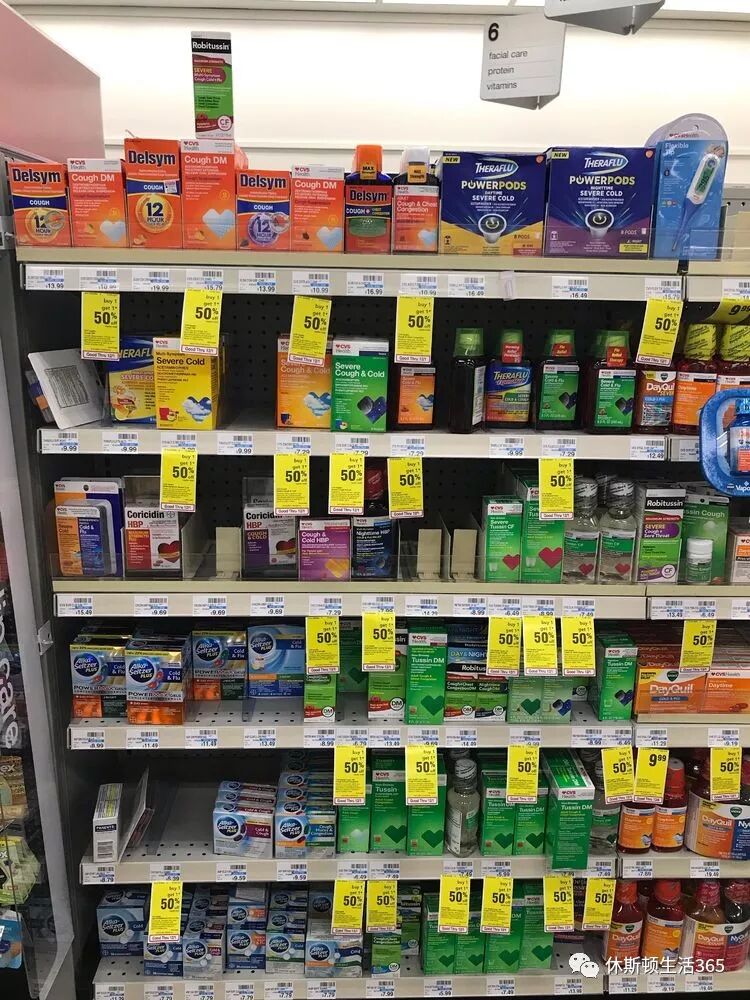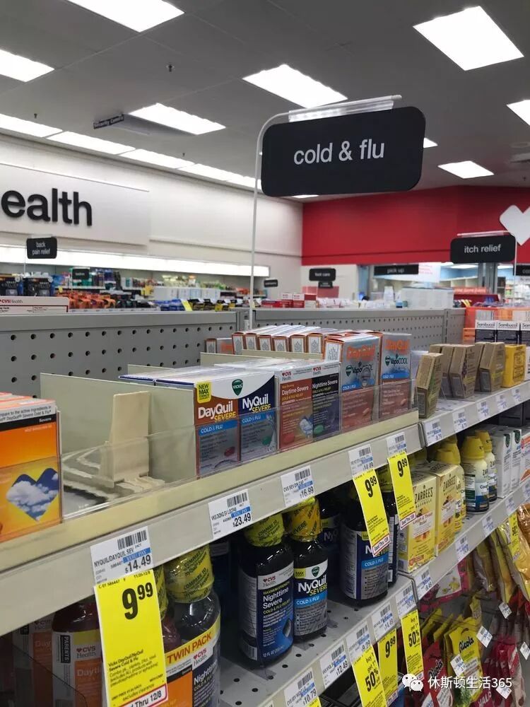 首先在药店里面这类药都摆一起,Cold&Flu 这一区。记得看这个大牌子就好。