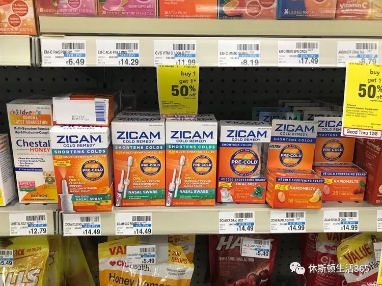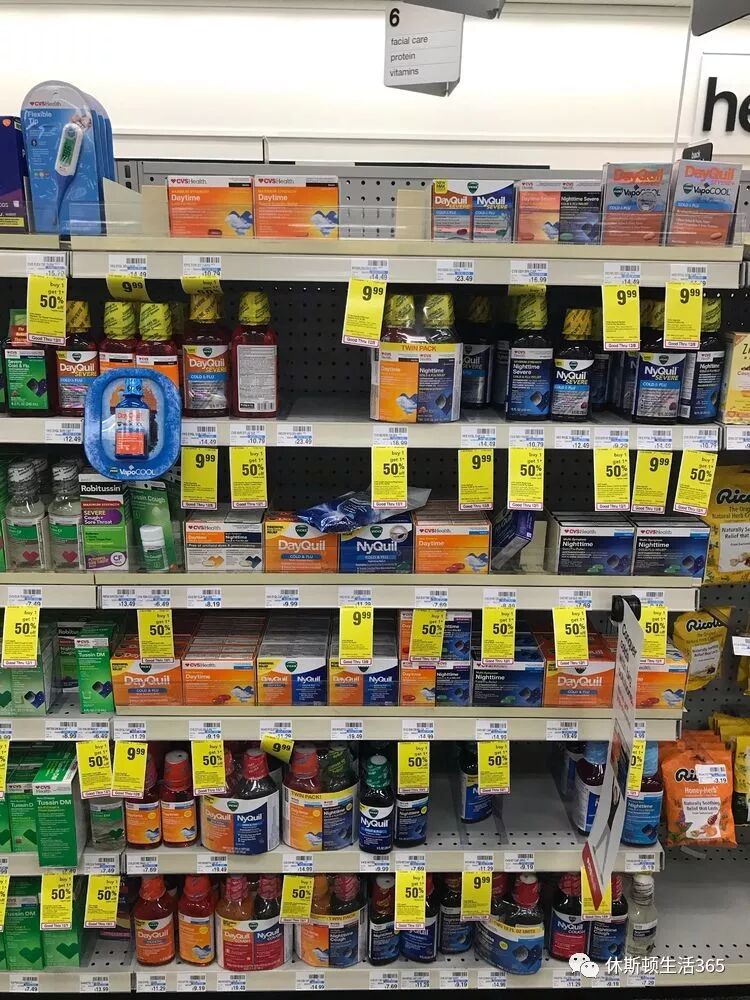 这张图里面有去年最抢手的2样,传说中可以治流感的药:Sambucol Black Elderberry和爆款小O:Oscillococciunm,反正我不太会念这个。去年这2样卖到断货,平均每天都有5个以上的人问哪里能买到它们。其实它们并没有什么有效成分,特别是小O,就是一无限稀释有效成分的Homeopathic medicine。以后我会讲讲什么是Homeopathic,说白了就是$35一盒的sugar pill,靠的是palcebo effect安慰剂效应的药。买不买看你自己喽。只要你觉得它有用,它就有用!