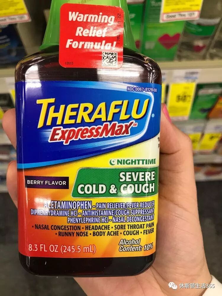 随手抓一瓶Theraflu,上面写了它能治鼻塞,头疼,喉咙痛,流鼻水,咳嗽,发烧,肌肉酸痛。还有标了ExpressMax,就是又快又有特效哦!看着就特别好对吧。