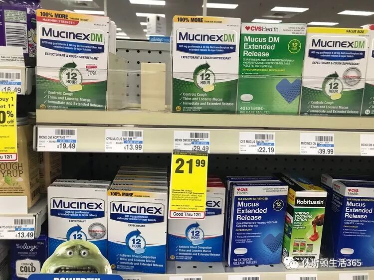 各种各样的Mucinex,它的主要成分就是那个化痰的Guaifenesine。它的原理就是让痰变稀容易咳出来。MucinexDM加了抑制咳嗽的成分。感觉上就很矛盾一边要他容易咳出来一边又不要他咳嗽。所以一般我推荐分开买,白天吃化痰的尽快清出来,晚上吃抑制咳嗽的好睡觉。