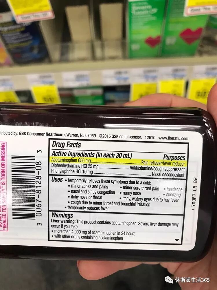 看看它的有效成分是什么?我们看到了Acetaminophen 和Phenylephrine,还记得这2样做什么吗?不记得往上看一看啊。