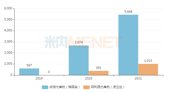 米内网数据显示,2021年重点省市公立医院终端PCSK9抑制剂用药市场达6463万元,增长率为111.55%。目前,依洛尤单抗和阿利西尤单抗两个产品已进入国家医保目录乙类品种。预计2022年重点省市公立医院终端PCSK9抑制剂将有大幅度的扩增。近年来国内重点省市公立医院终端降胆固醇PCSK9抑制剂销售额(单位:万元)