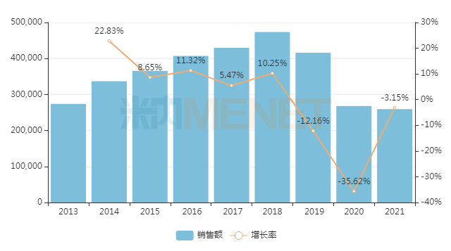 米内网数据显示,2021年国内重点省市公立医院终端调血脂药品市场规模超过了25亿元,下滑幅度较上一年明显缩小。近年来国内重点省市公立医院终端血脂调节剂年度销售趋势(单位:万元)