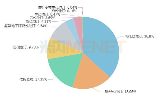 HMGCoA还原酶抑制剂简称他汀类药物。米内网数据显示,2021年重点省市公立医院终端他汀类药物及复方用药等10个品种占据了调血脂市场的84.58%。TOP5品种分别是阿托伐他汀36.80%,瑞舒伐他汀18.06%,依折麦布17.35%,普伐他汀9.78%,氨氯地平阿托伐他汀9.54%。