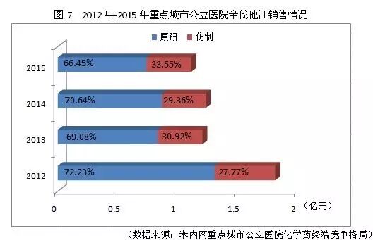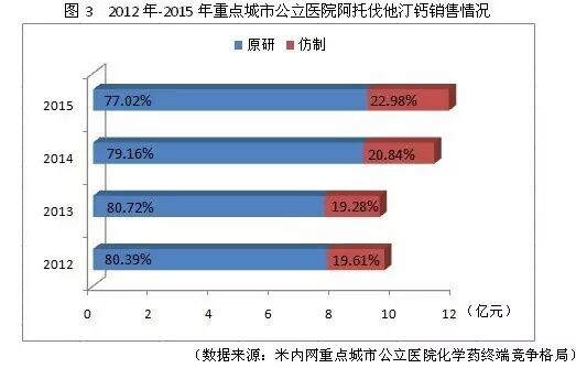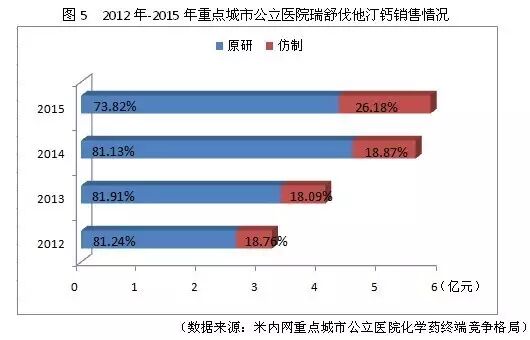 2012年以来,该品种市场销售一路高歌,2014年销售额甚至达到了超过35%的年增长率,销售市场由原研企业主导。不过随着我国仿制企业的快速行动,仿制企业所占市场份额不断提高,在2015年获得26.18%的市场份额。