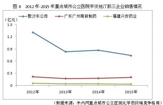 辛伐他汀自2009年进入国家基药目录,同时面临瑞舒伐他汀、阿托伐他汀等同类品种竞争,其销售渠道开始下沉至基层医疗终端,近四年的销售数据显示辛伐他汀在重点城市样本医院的销售呈现下滑趋势。