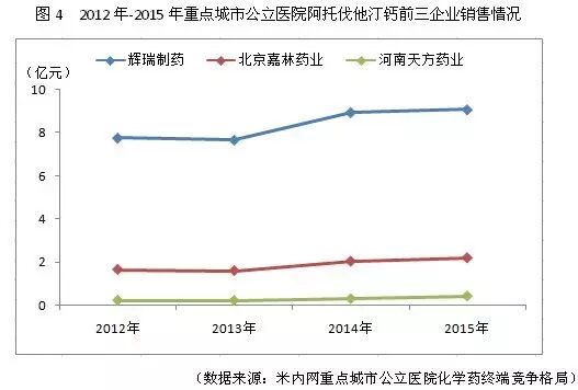 2015年,重点城市公立医院阿托伐他汀钙销售市场由辉瑞制药、北京嘉林药业、河南天方药业三家企业占据了超过99%的份额。