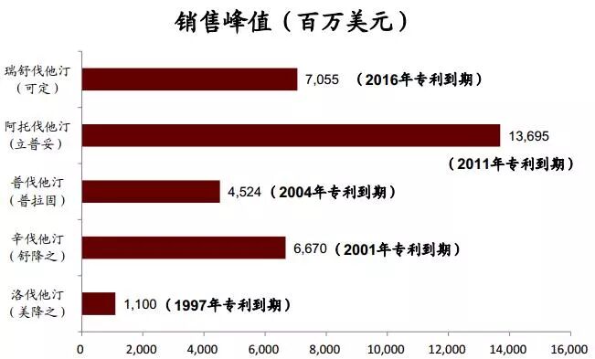 ▲ 他汀类药物销售峰值和专利到期时间