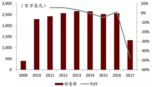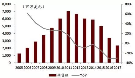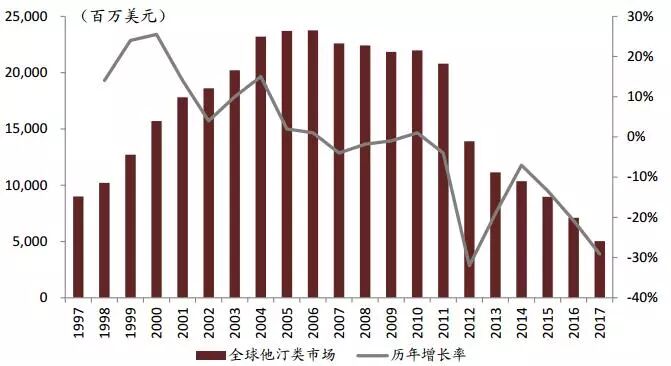 ▲ 1997年-2017年全球他汀类药物销售额及增长额