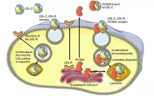 血液中的低密度脂蛋白胆固醇(LDL),即坏胆固醇,可通过其受体(LDL-R)特异性结合在肝脏得到清除。而PCSK9可以与LDL-R结合导致后者加速降解,因此导致低密度脂蛋白胆固醇水平显著升高。