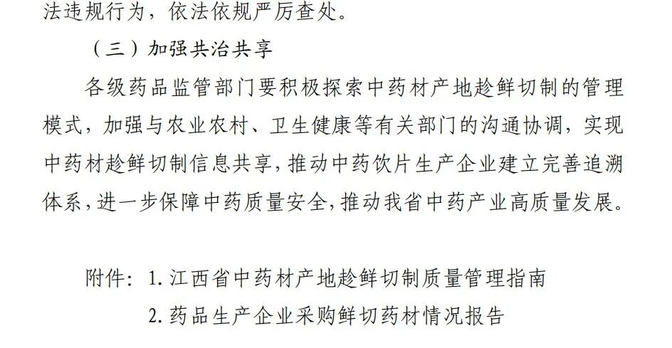 为提升赣产中药材、中药饮片质量,推动中药材产地加工科学化、规范化、标准化,促进中药传承创新高质量发展,根据国家药监局综合司《关于对中药饮片生产企业采购产地加工(趁鲜切制)中药材有关问题的复函》(药监综药管函〔2021〕367号)等文件要求,结合我省实际和前期试点工作情况,现就进一步规范我省中药生产企业自行组织产地趁鲜切制或采购产地趁鲜切制中药材(以下简称鲜切药材)工作提出如下指导意见。