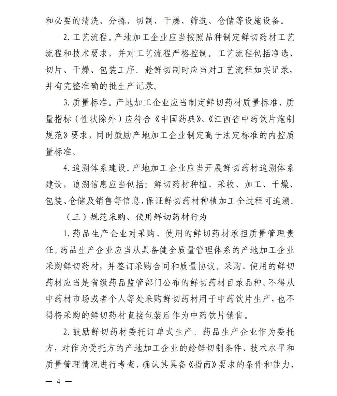 3.质量标准。产地加工企业应当制定鲜切药材质量标准,质量指标(性状除外)应符合《中国药典》、《江西省中药饮片炮制规范》要求,同时鼓励产地加工企业制定高于法定标准的内控质量标准。