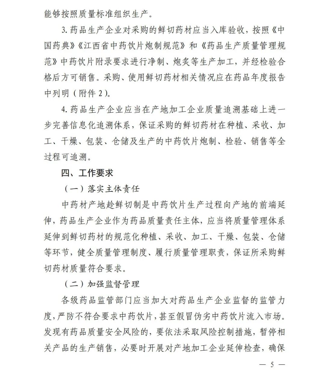 3.药品生产企业对采购的鲜切药材应当入库验收,按照《中国药典》《江西省中药饮片炮制规范》和《药品生产质量管理规范》中药饮片附录要求进行净制、炮炙等生产加工,并经检验合格后方可销售。采购、使用鲜切药材相关情况应在药品年度报告中列明(附件2)。